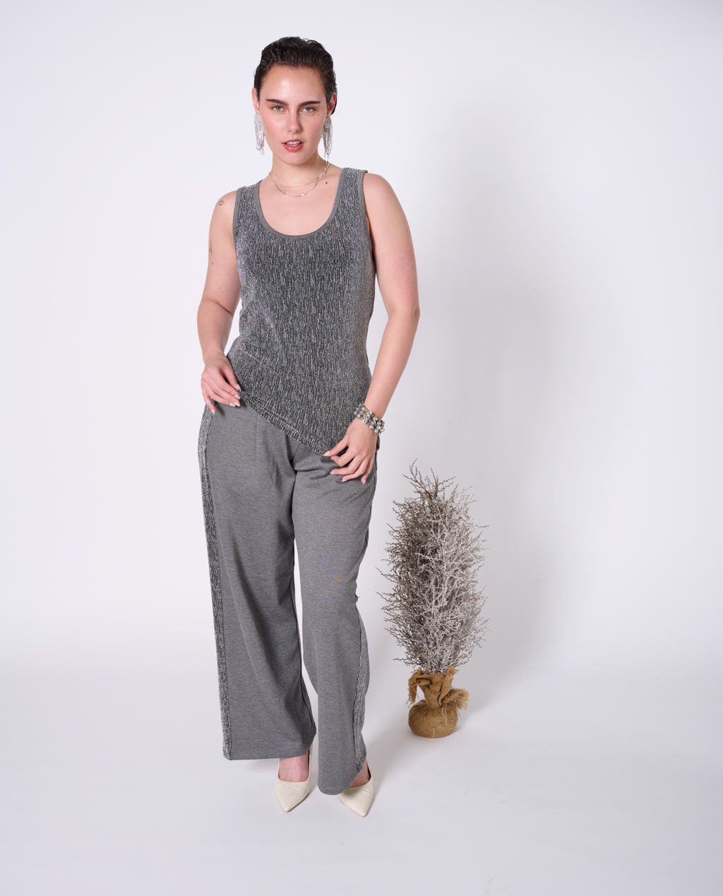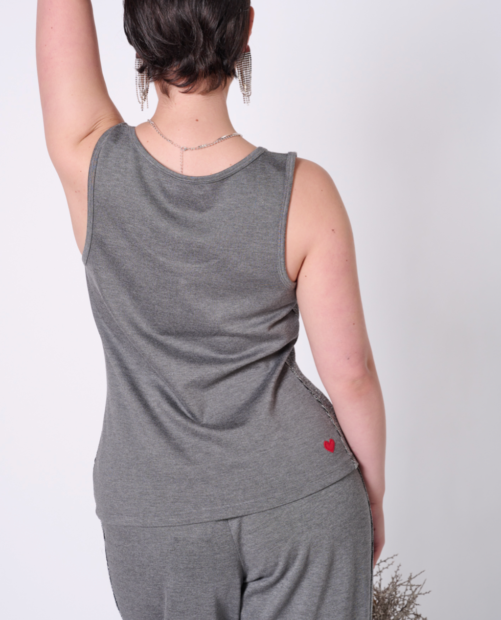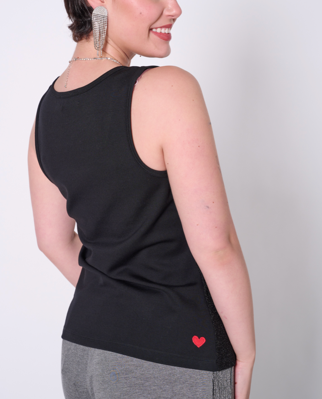 Fancy yet comfortable top with scoop neck. Luxurious metallic fabric in the front and stretchy ponte in the back. Perfect for layering or pairing with your favourite holiday dinner party bottoms. Featuring our upcycled red heart patch on the back.