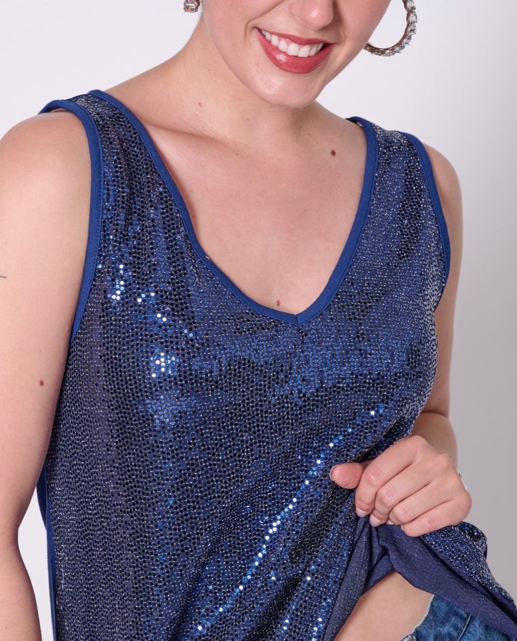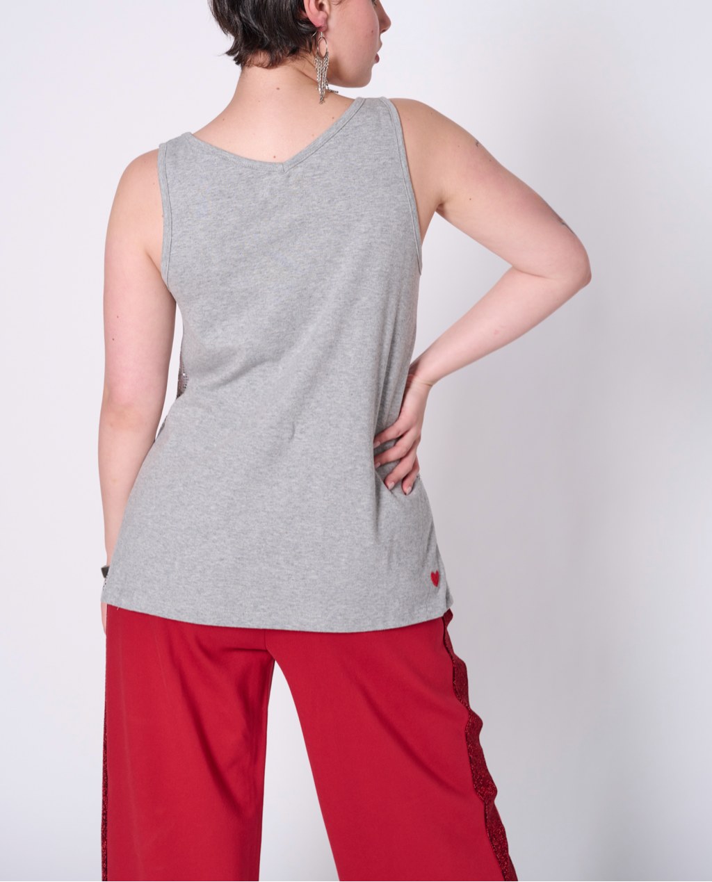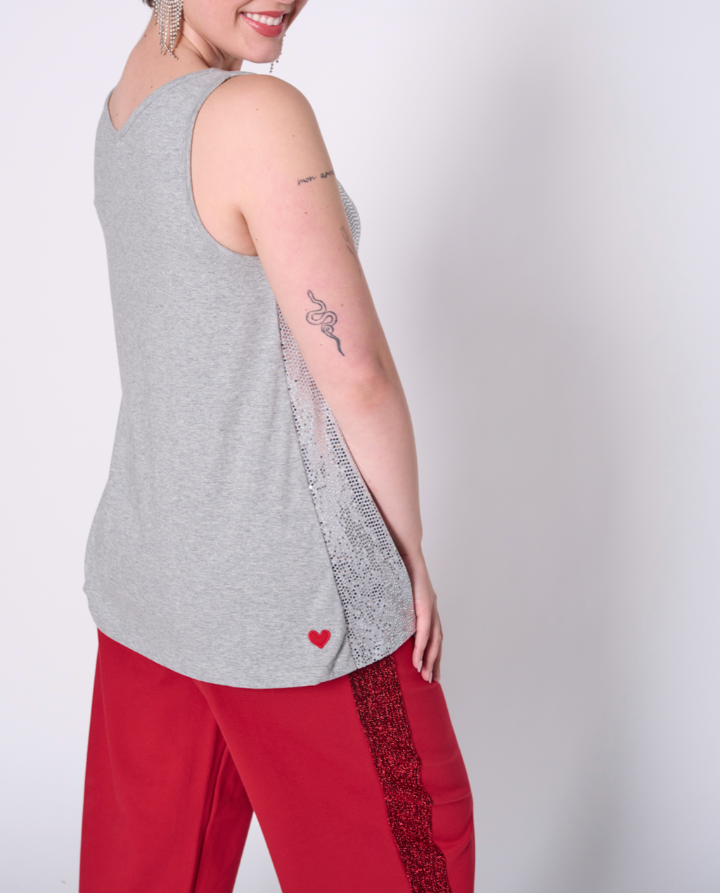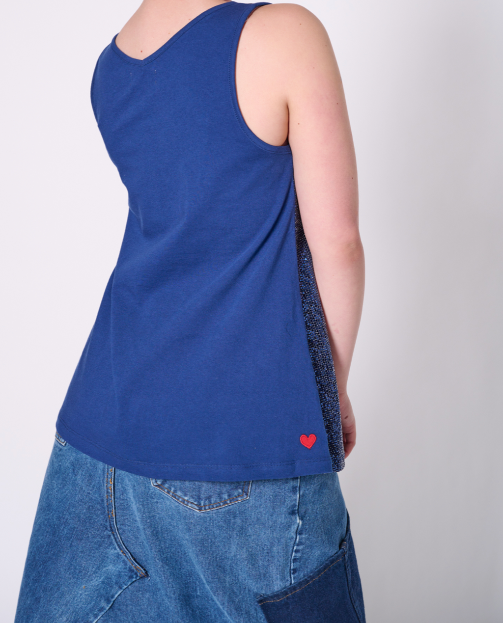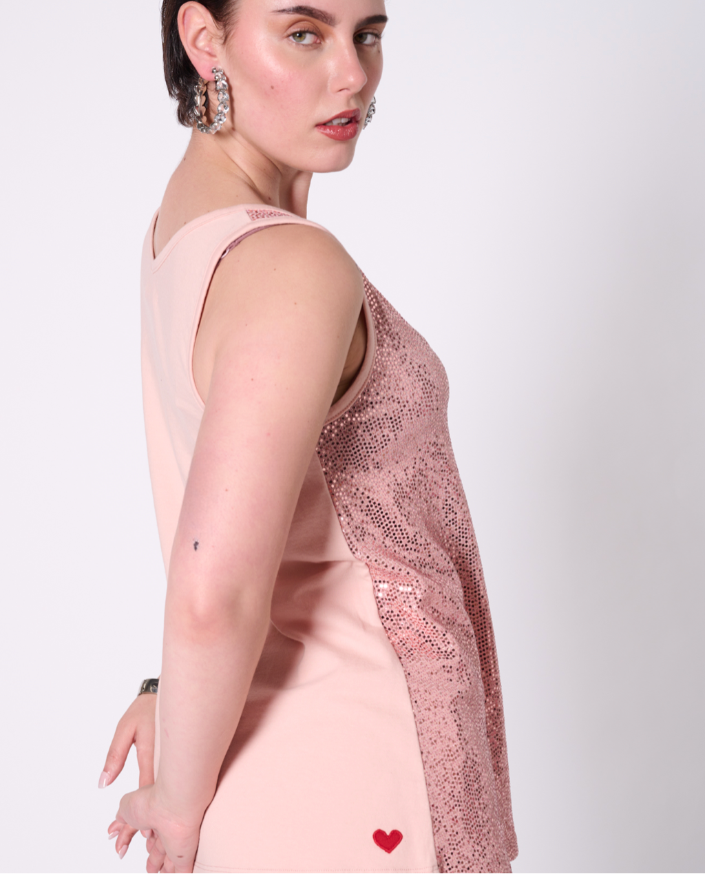 Sleeveless top with all-over sequin fabric and back made with 100% cotton jersey, 50% recycled yarn. Featuring our upcycled red heart patch on the back.