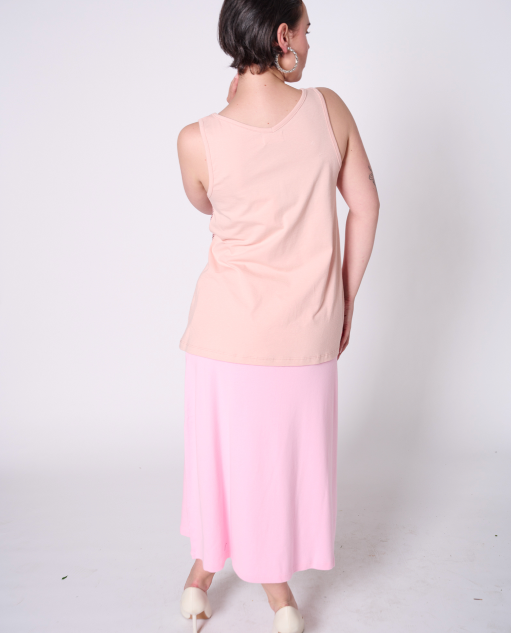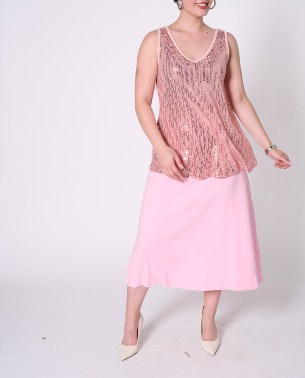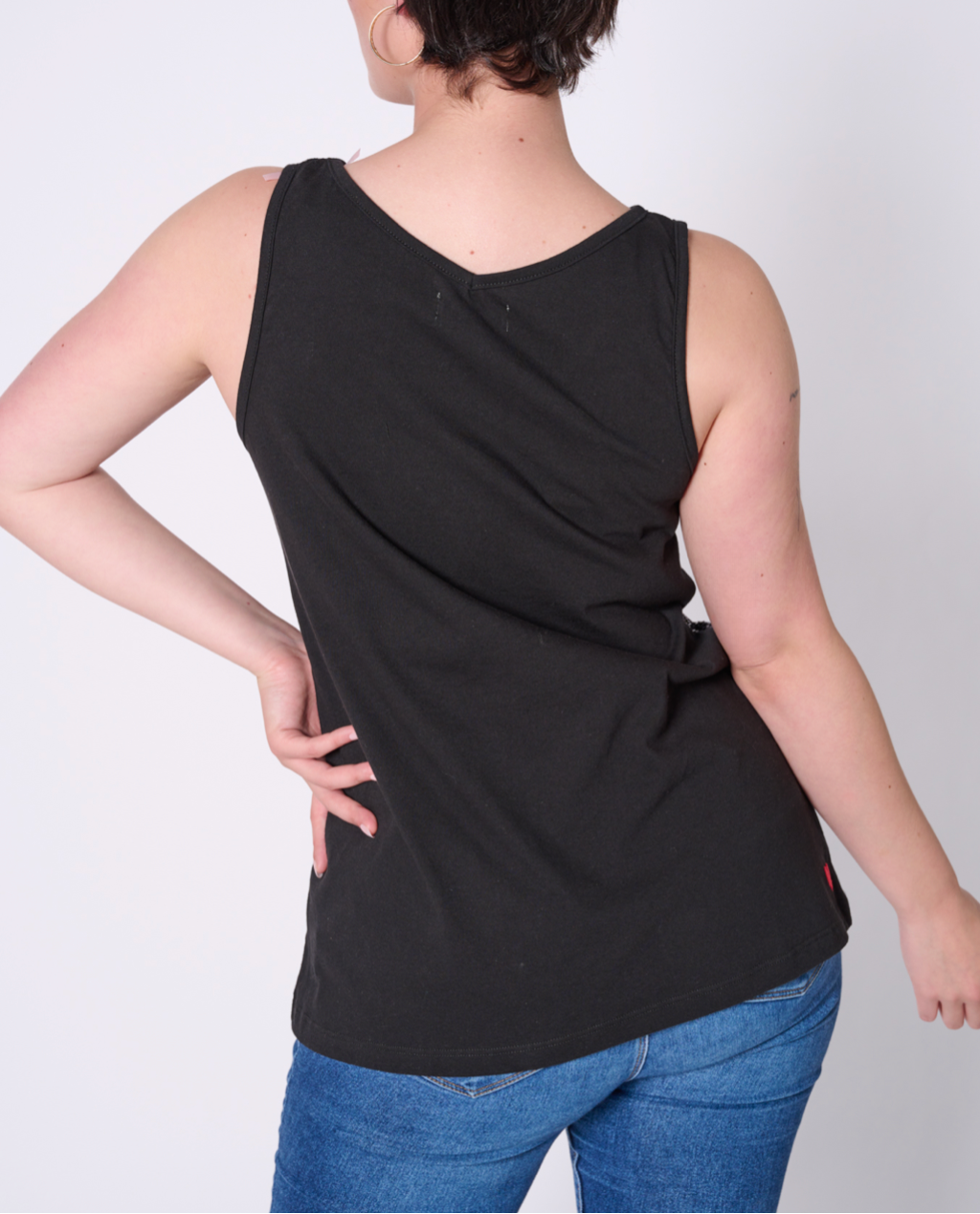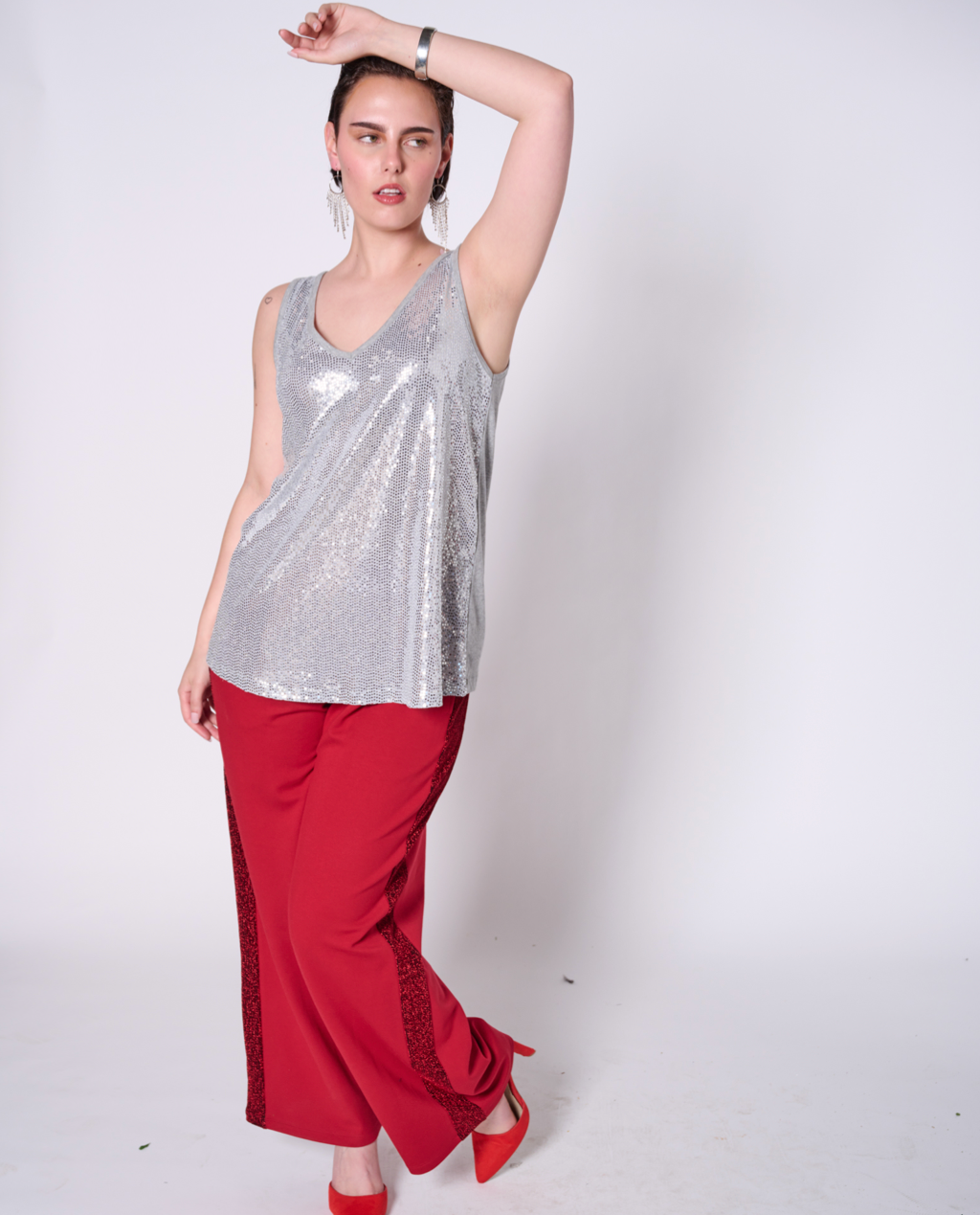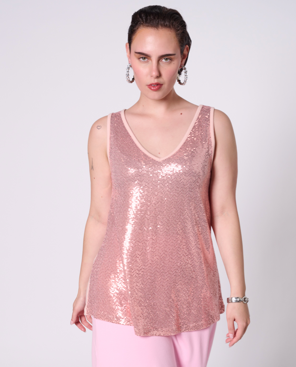 Sleeveless top with all-over sequin fabric and back made with 100% cotton jersey, 50% recycled yarn. Featuring our upcycled red heart patch on the back.