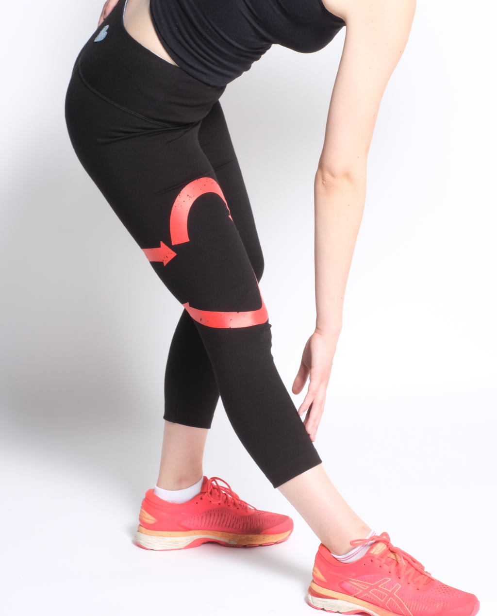 Comfortable high-waisted cropped leggings with upcycled stripe details on the inside waistband and upcycled denim heart patch on the back.