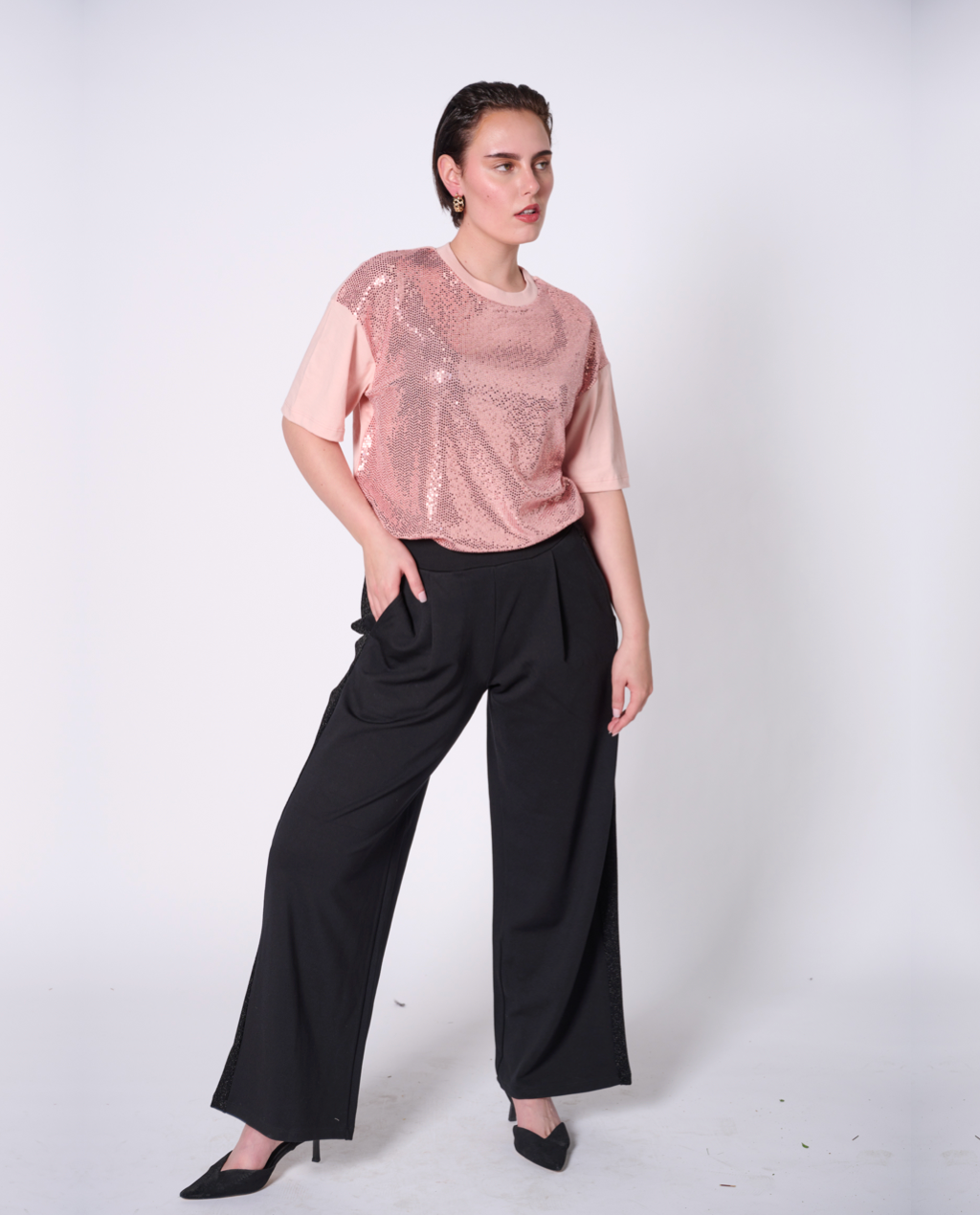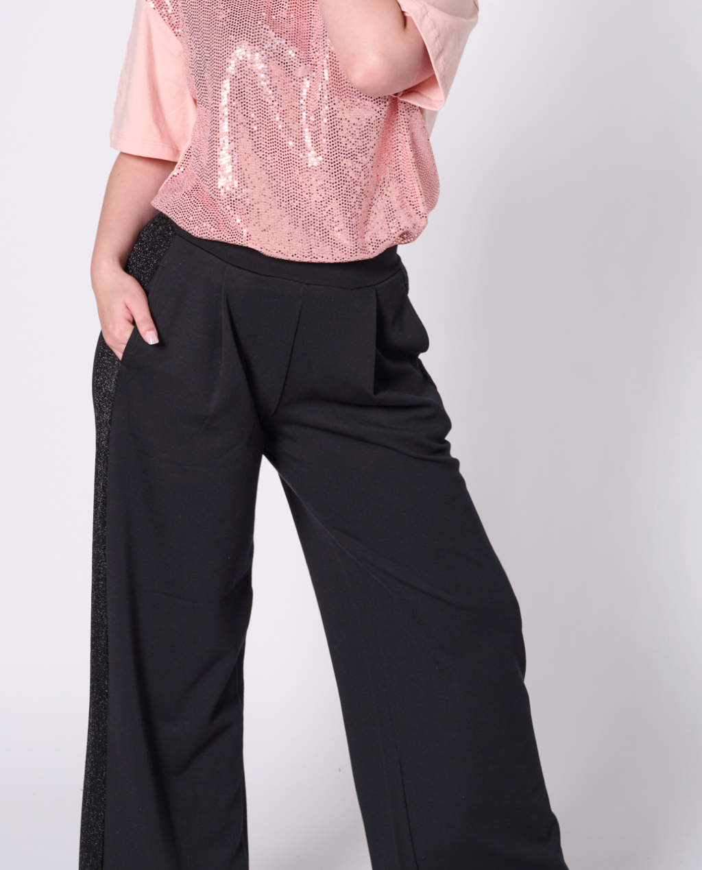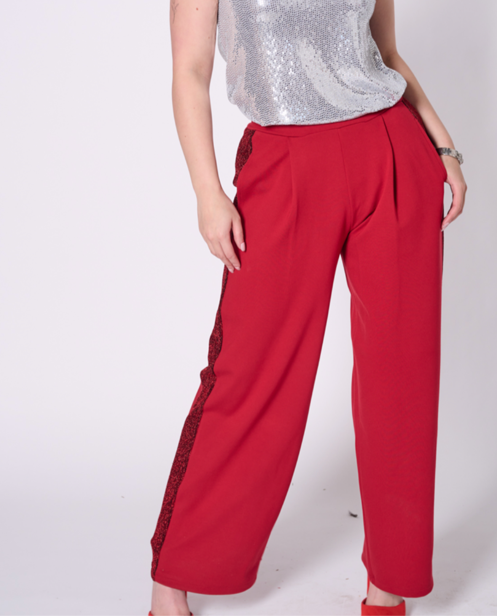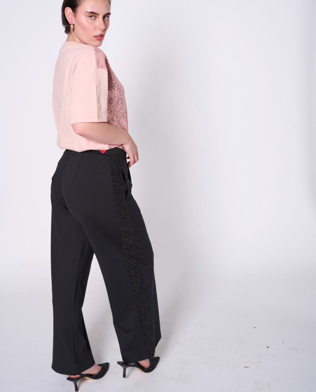 Tailored trouser inspired pants, wiith a pull-on stretchy fit but a refined look, and functional pockets. With a metallic racing stripe down the sides, ponte body. Featuring our upcycled red heart patch on the back.