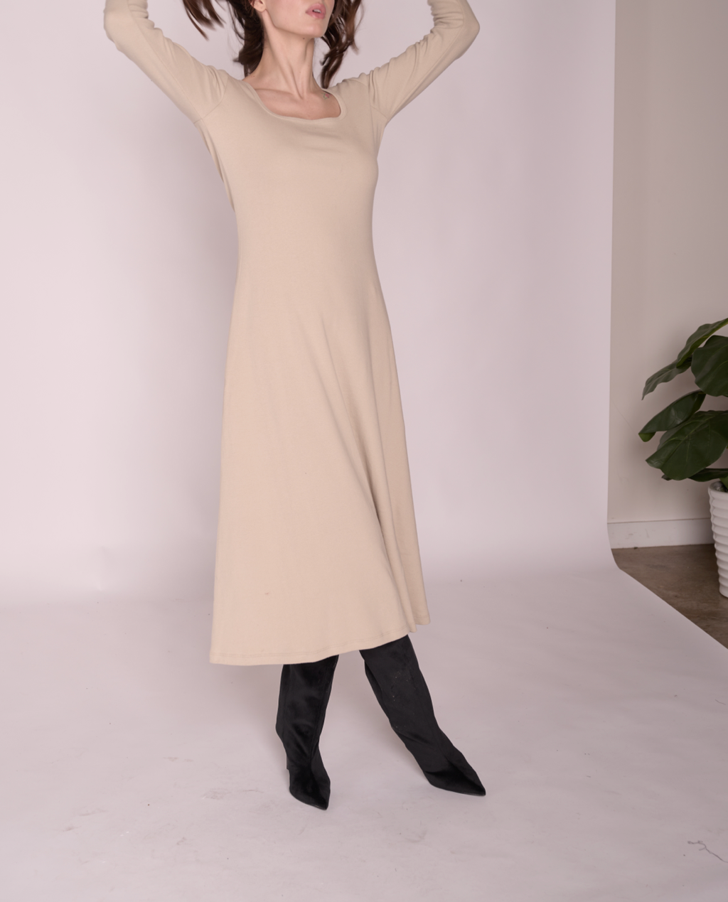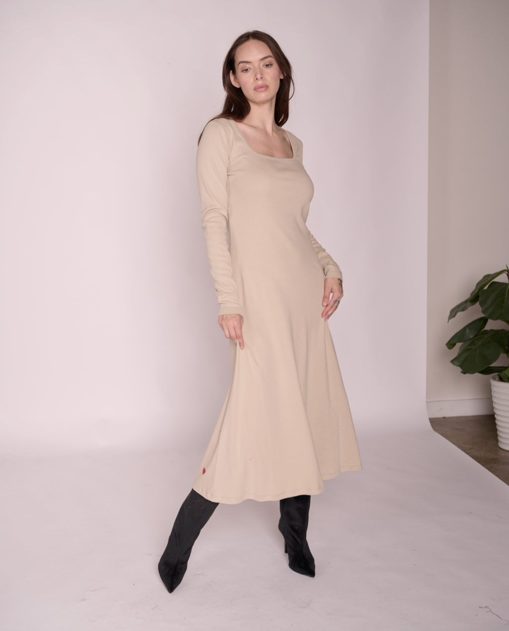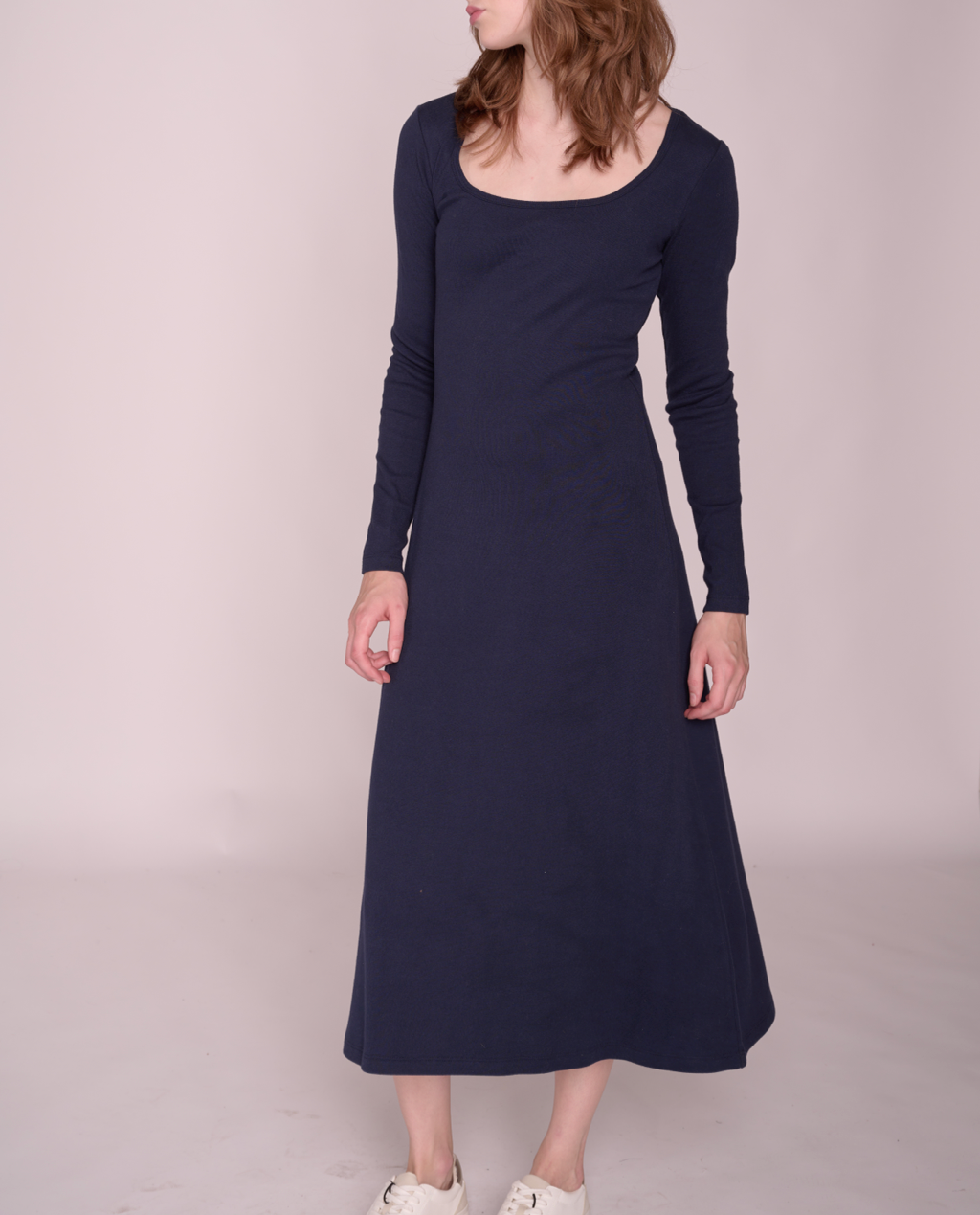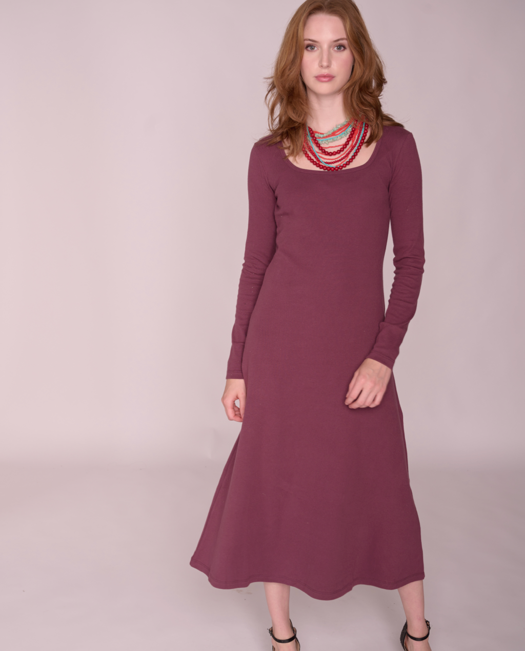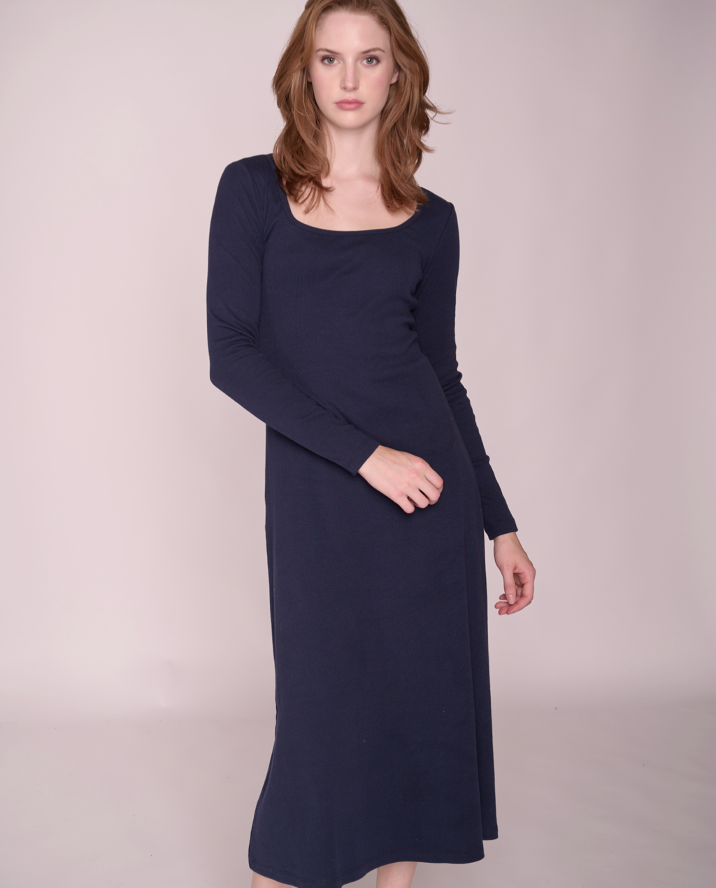 Cozy and flattering, classic midi dress, sliming bodice with a-line skirt. Stretchy 100% cotton rib fabric, with beautiful square neckline.