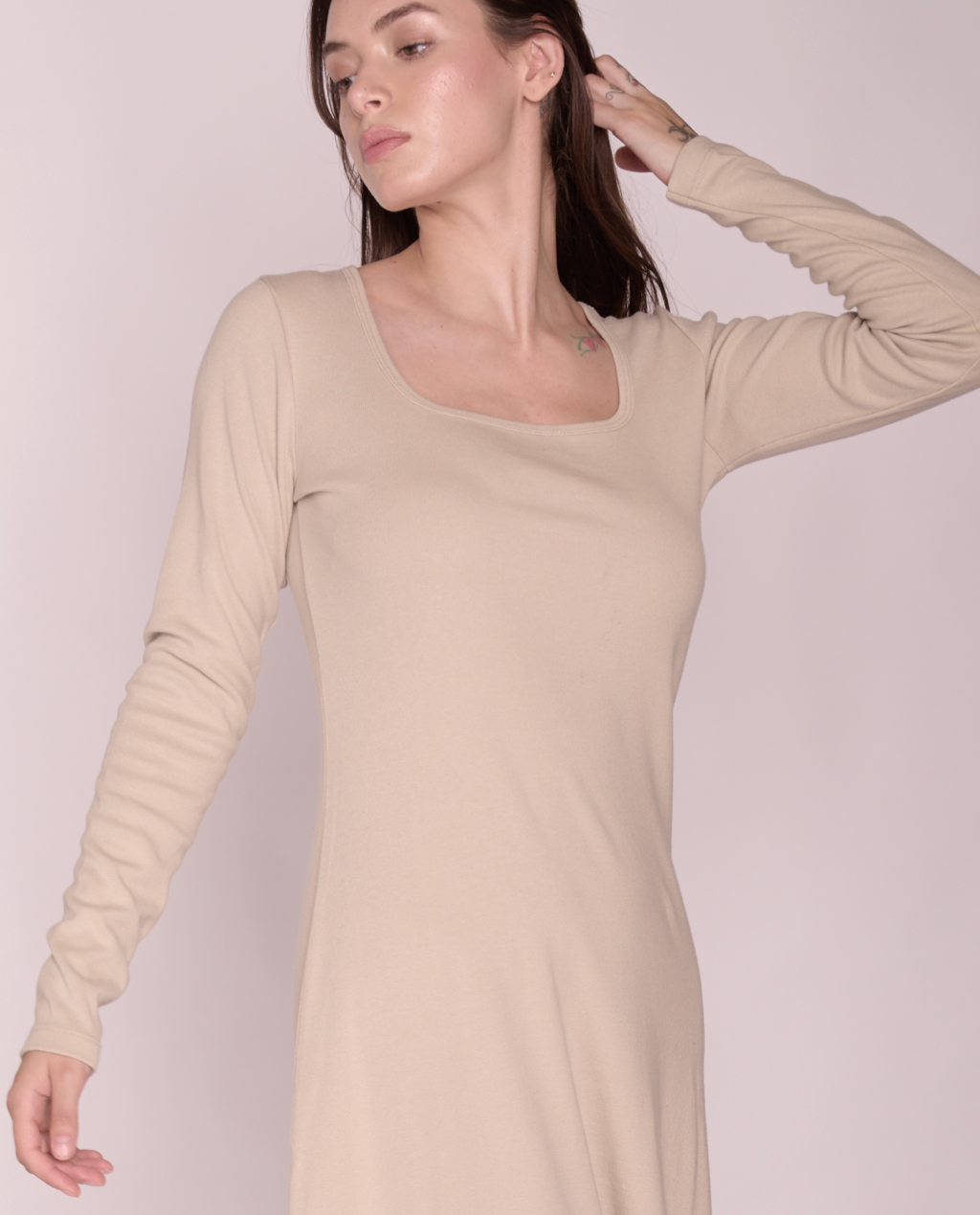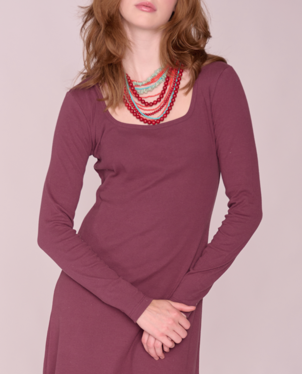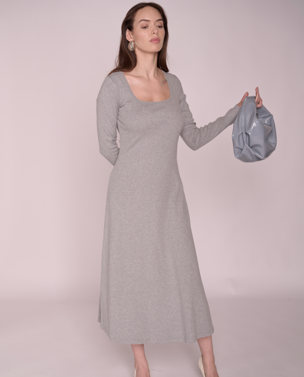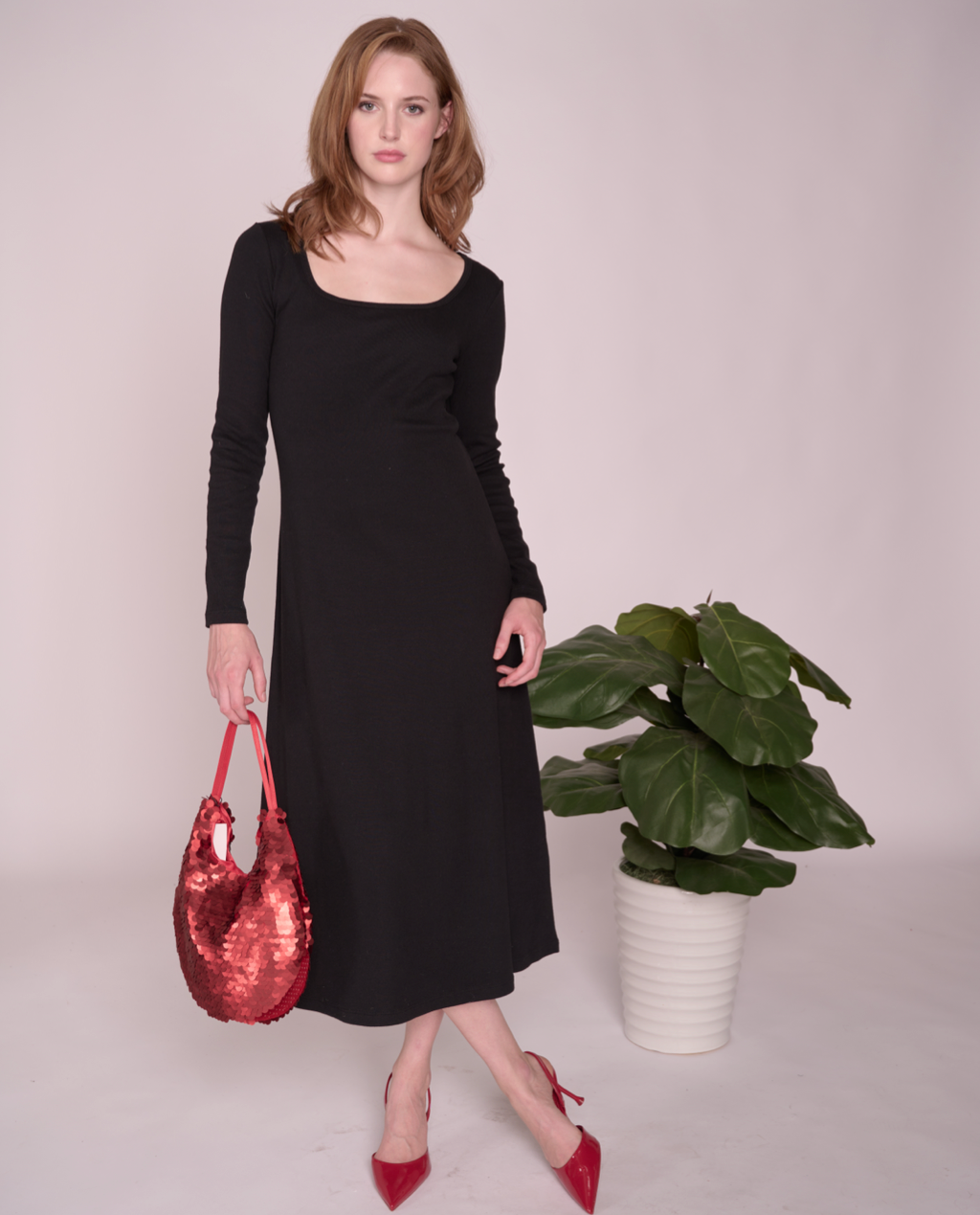 Cozy and flattering, classic midi dress, sliming bodice with a-line skirt. Stretchy 100% cotton rib fabric, with beautiful square neckline.
