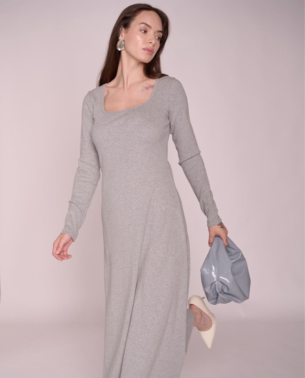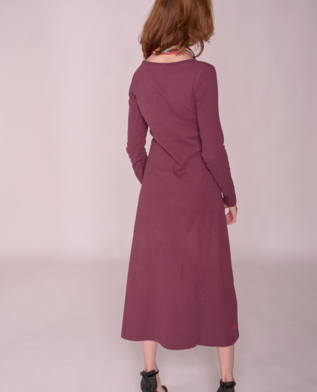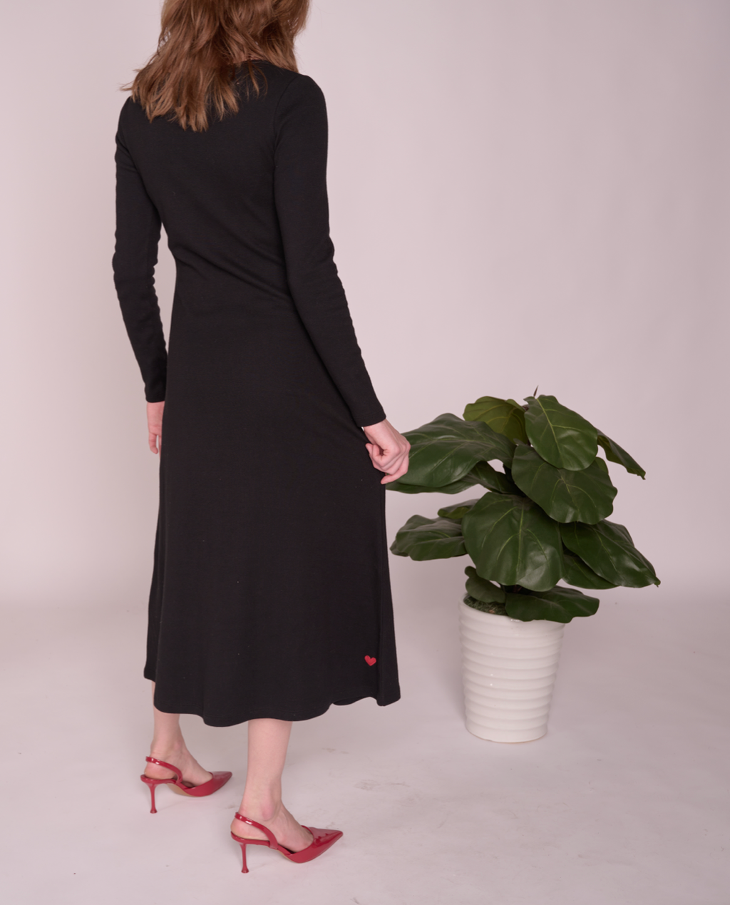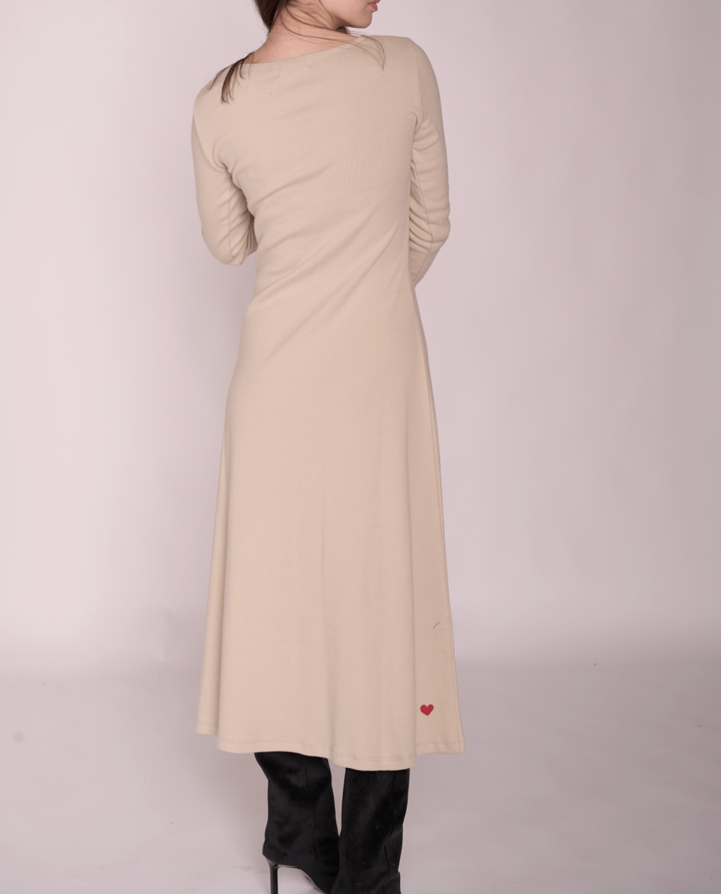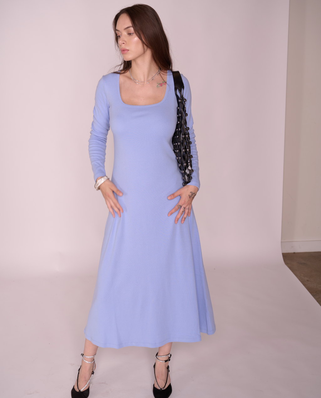Cozy and flattering, classic midi dress, sliming bodice with a-line skirt. Stretchy 100% cotton rib fabric, with beautiful square neckline.