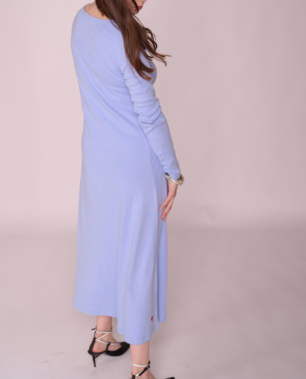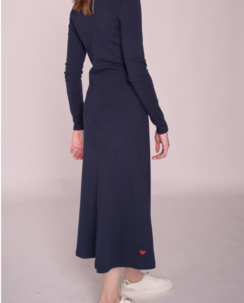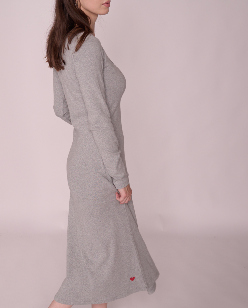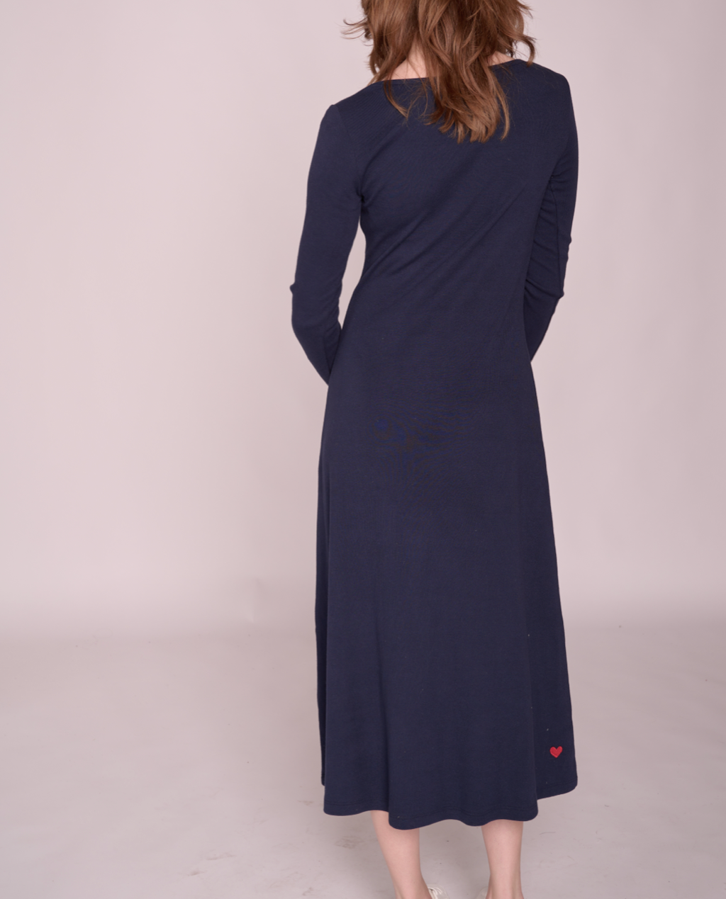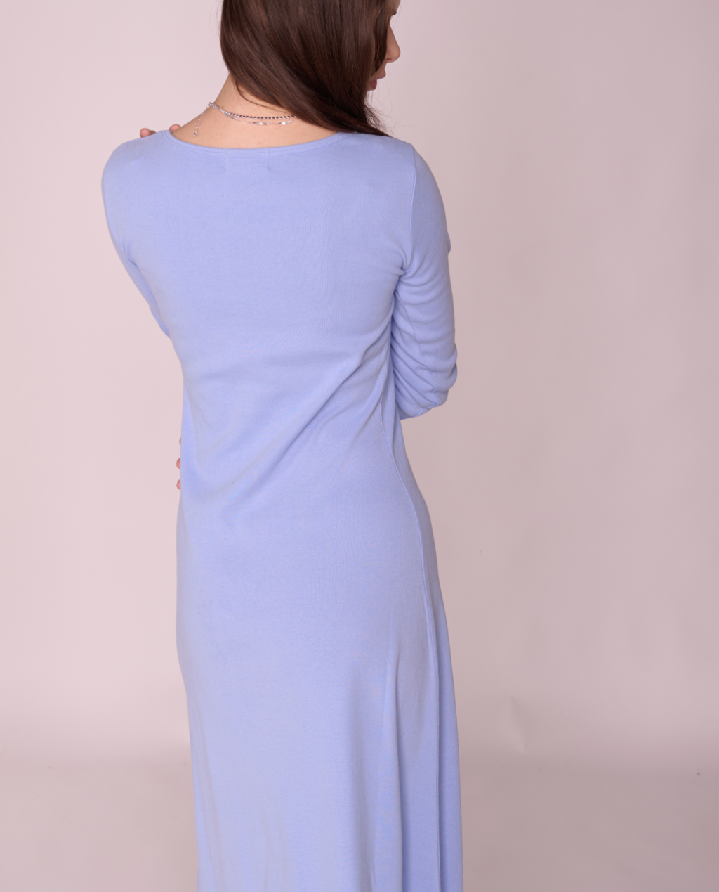 Cozy and flattering, classic midi dress, sliming bodice with a-line skirt. Stretchy 100% cotton rib fabric, with beautiful square neckline.