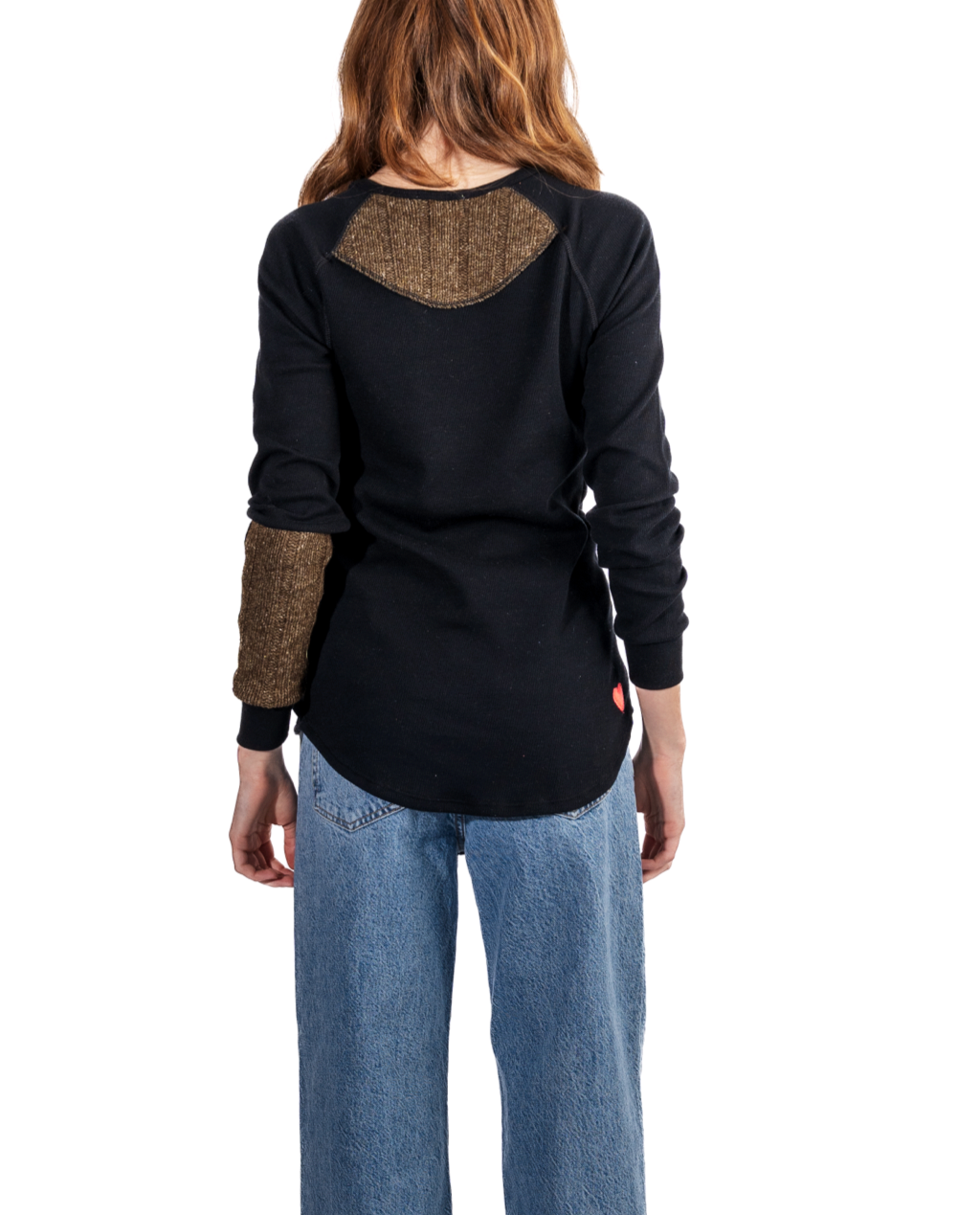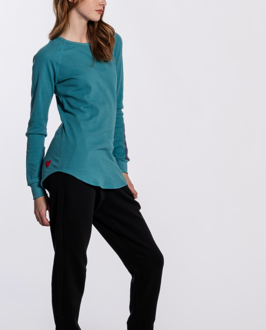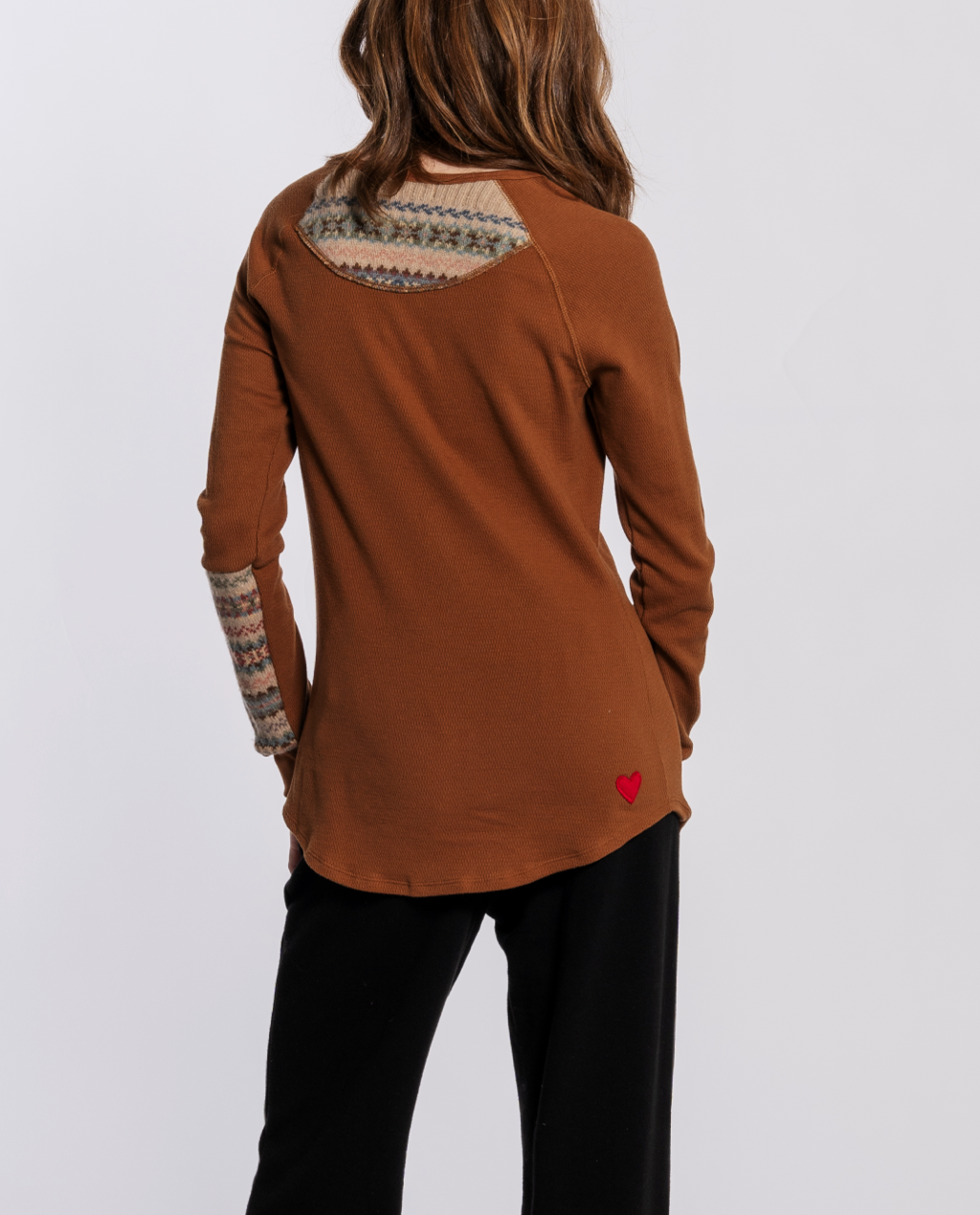 This sustainable and comfortable long sleeve top is made with 100% cotton thermal fabric. Features vintage sweater material accent on one the sleeve, and back yoke, and red heart patch on the back.