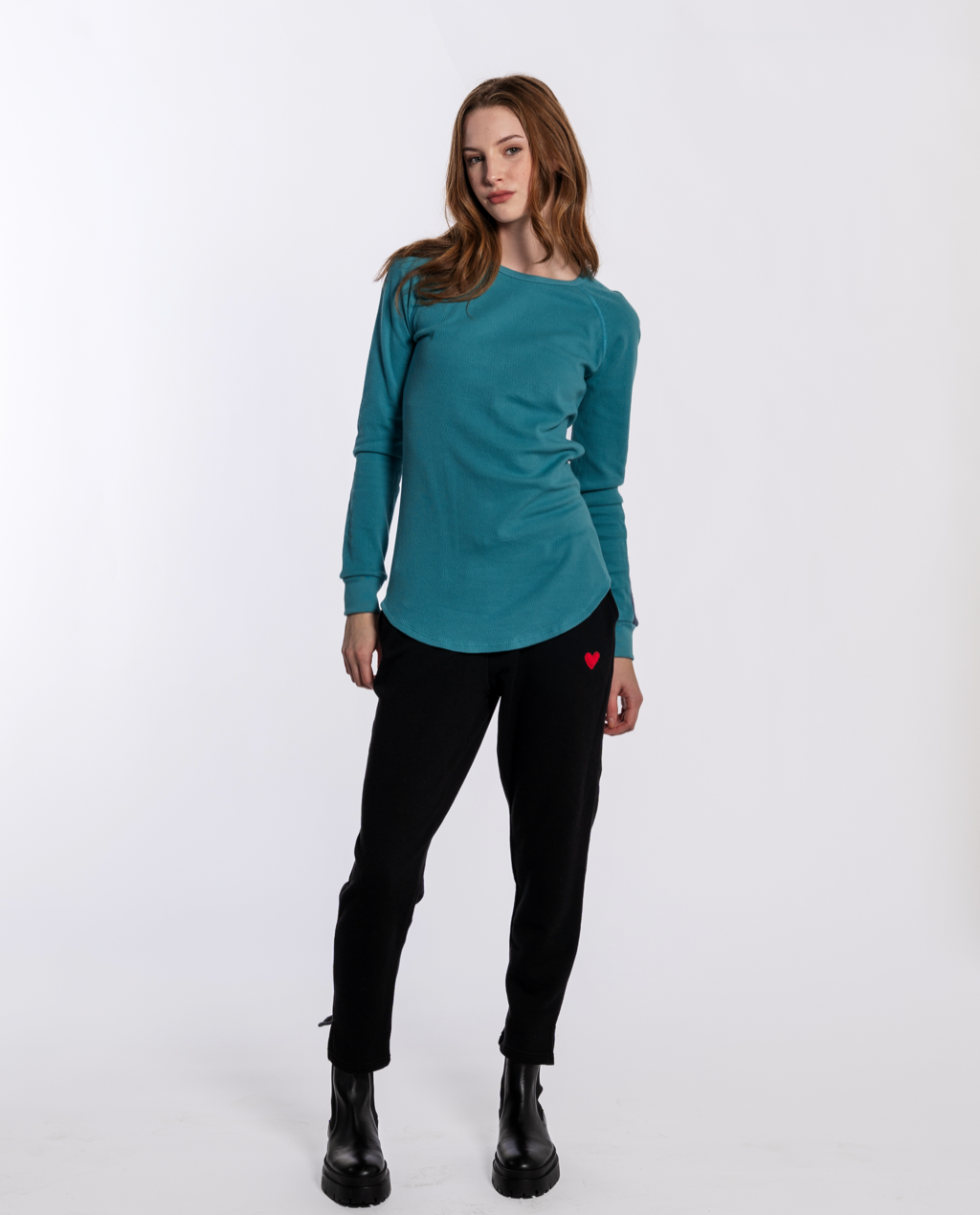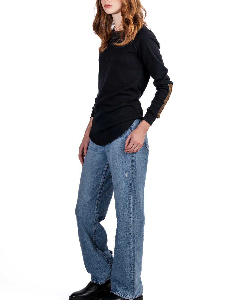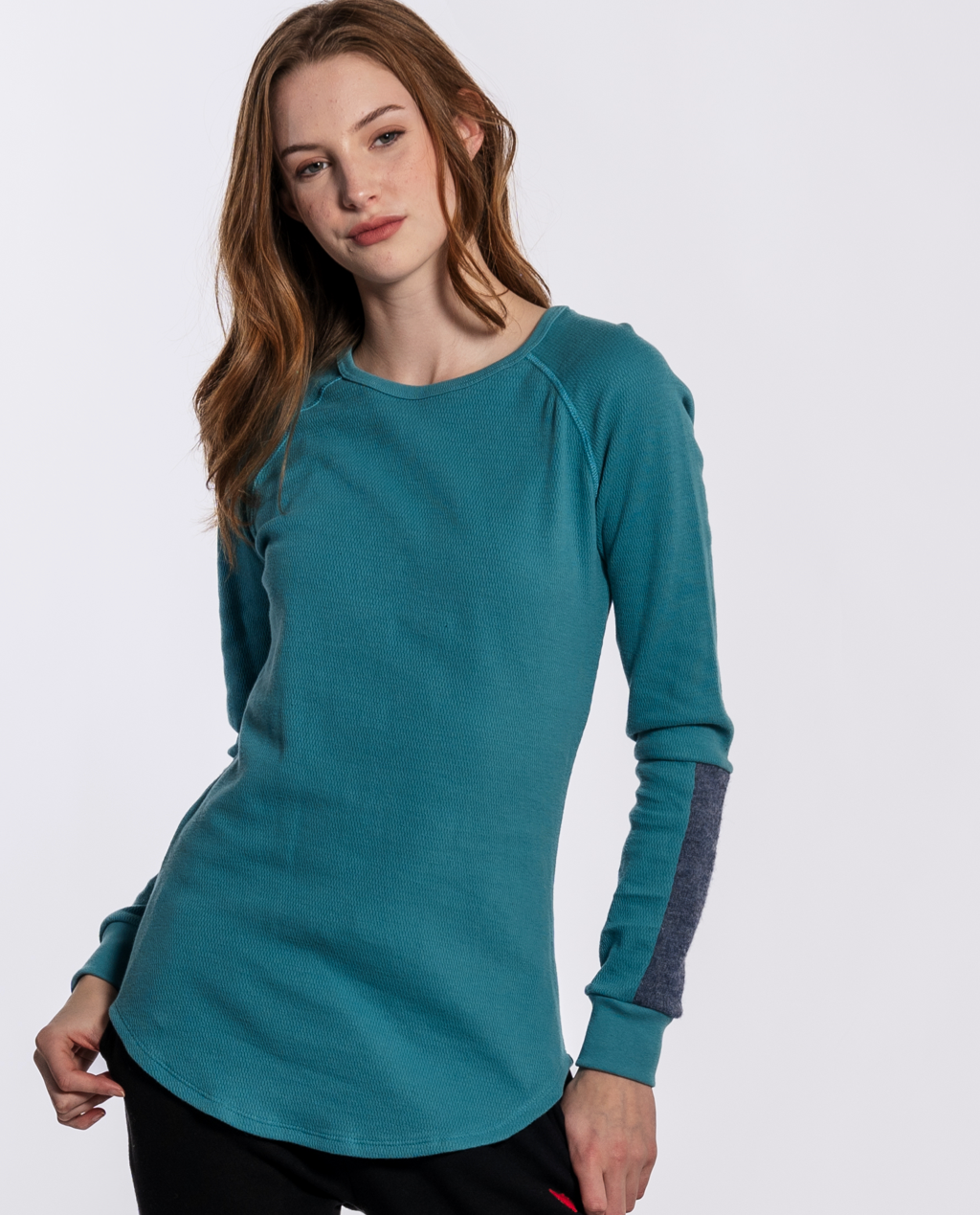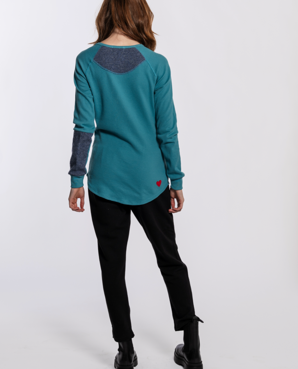 This sustainable and comfortable long sleeve top is made with 100% cotton thermal fabric. Features vintage sweater material accent on one the sleeve, and back yoke, and red heart patch on the back.