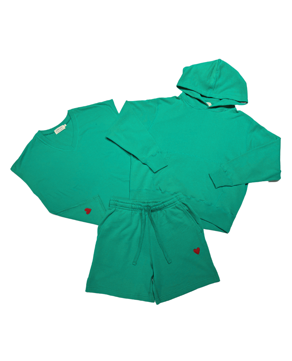 Structured hoodie with front pockets, featuring our signature heart patch on the back. 100% cotton terry with 50% recycled materials.