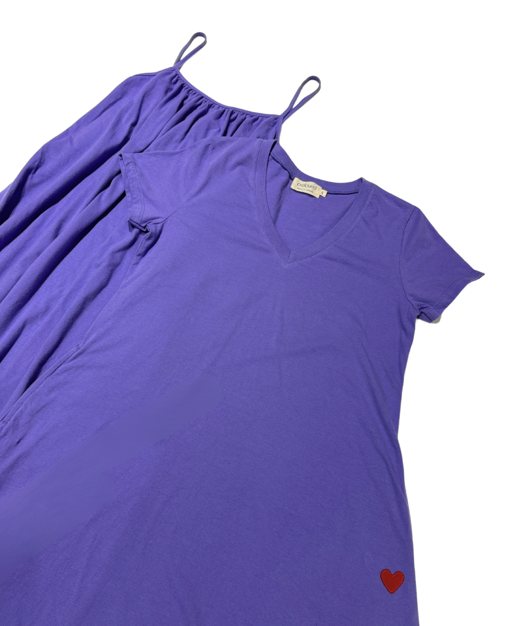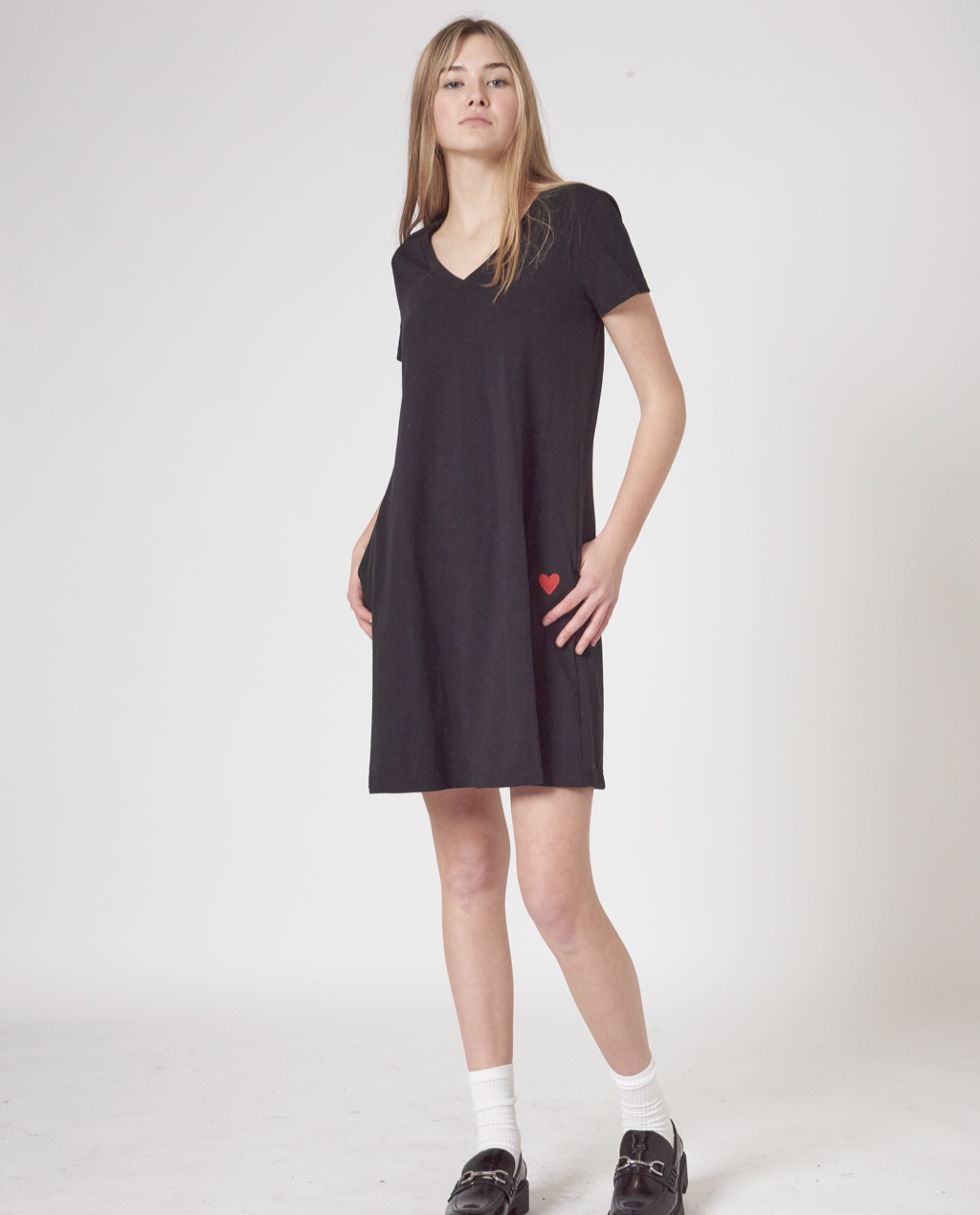 Easy to wear v-neck t-shirt dress, slight flare and the best part are the pockets. Made with 100% and 50% recycled materials, featuring our signature heart patch on the back.