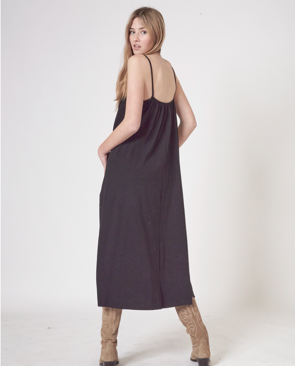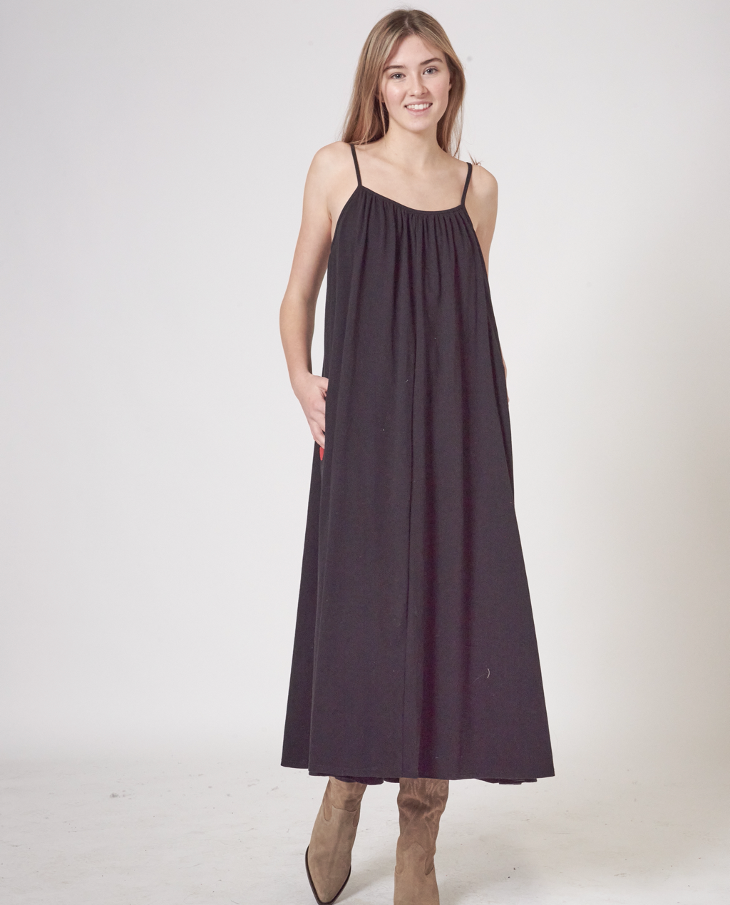 Maxi dress that is flowy and flattering for every body shape, the Dionne features a gathered detail at the neckline. Made with soft 100% cotton and 50% recycled materials.