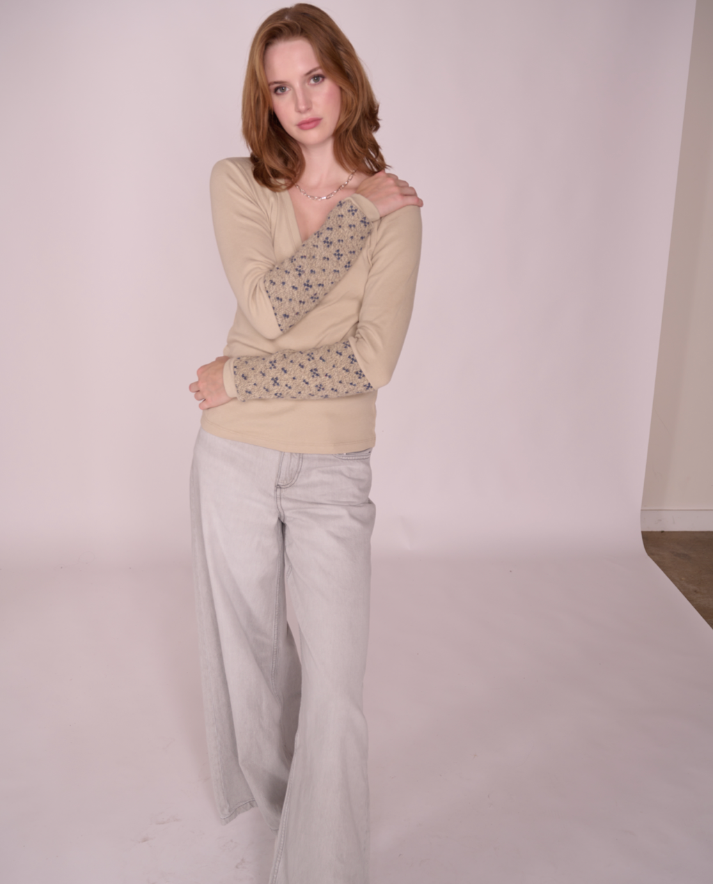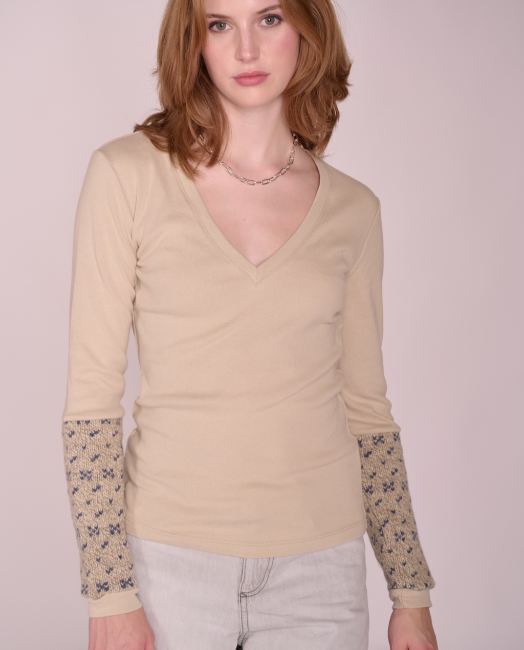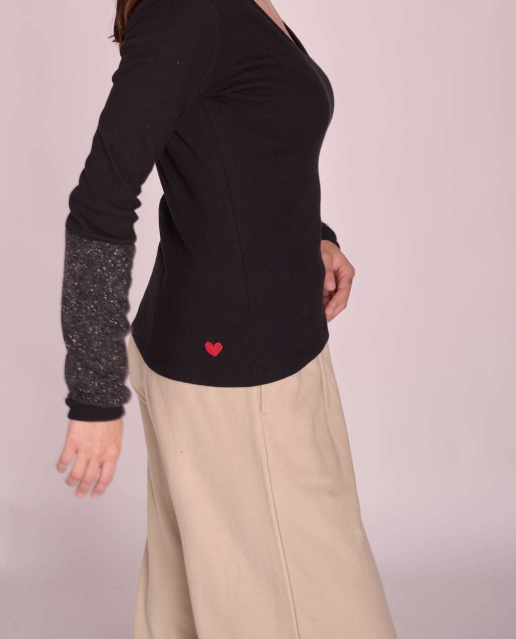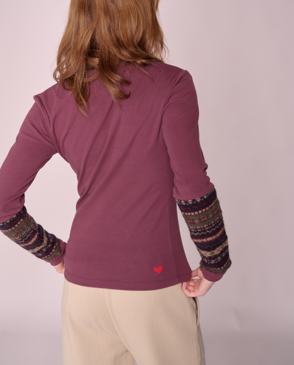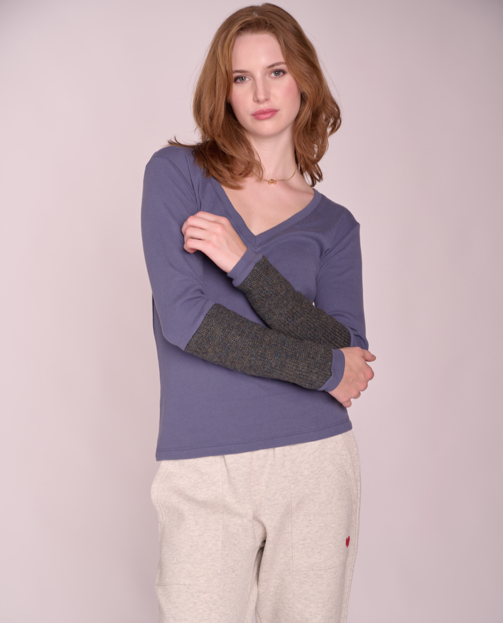 A pop of upcycled wool sweaters, turns this basic 100% cotton long sleeve v-neck top into a one-of-a-kind gem. Paired perfectly with a pair of jeans or a maxi skirt.