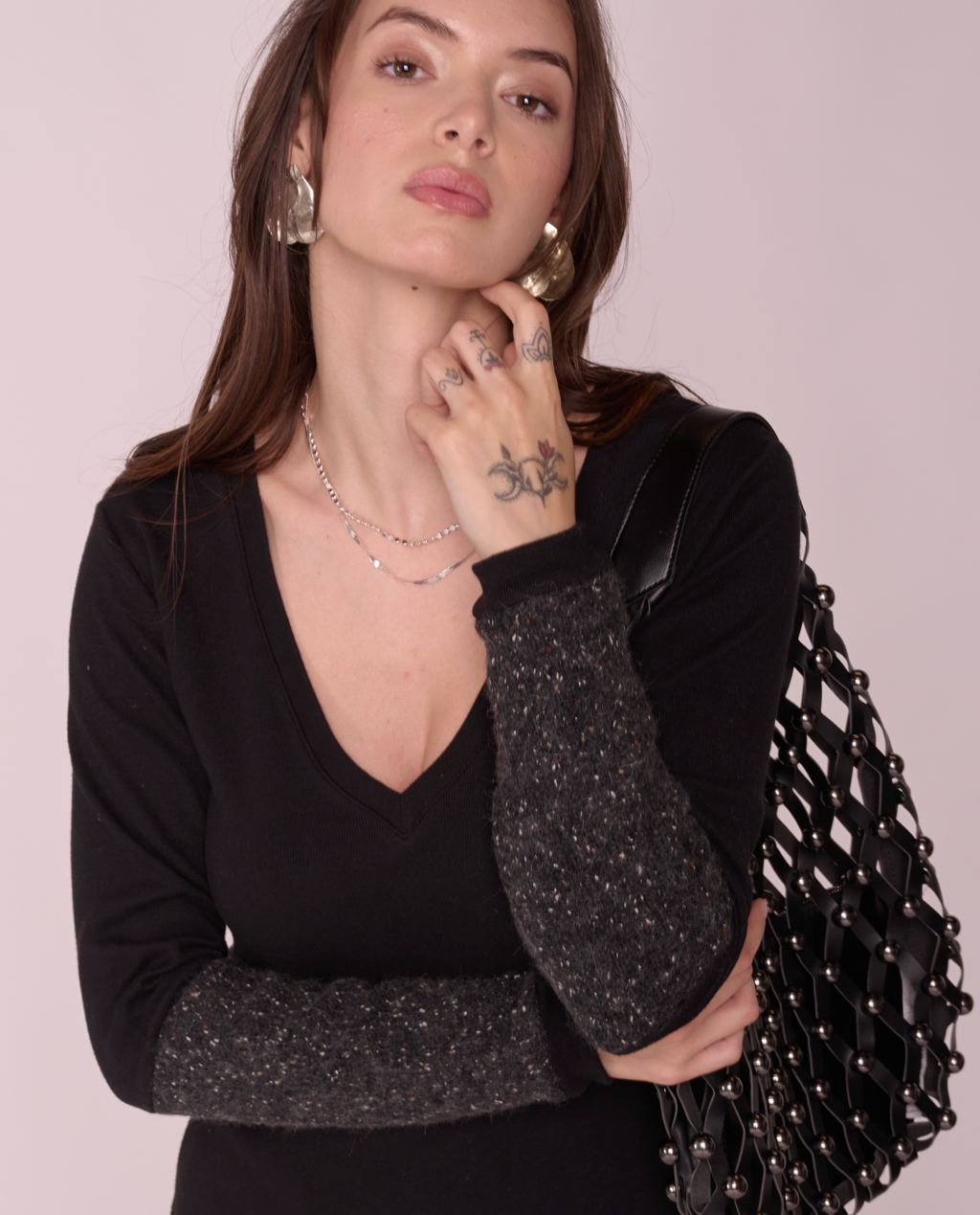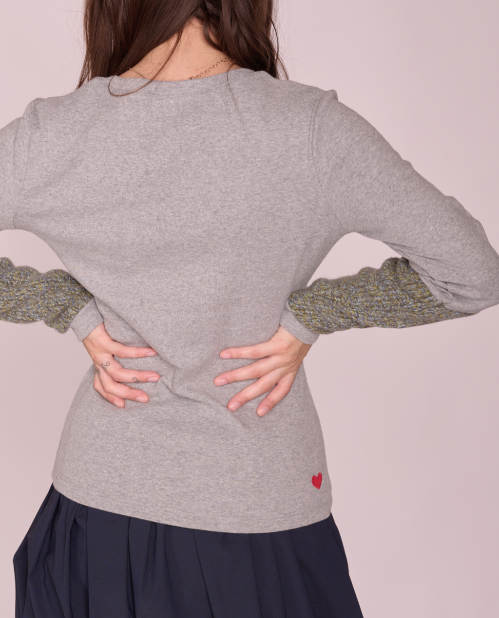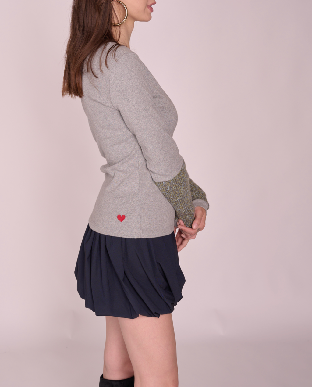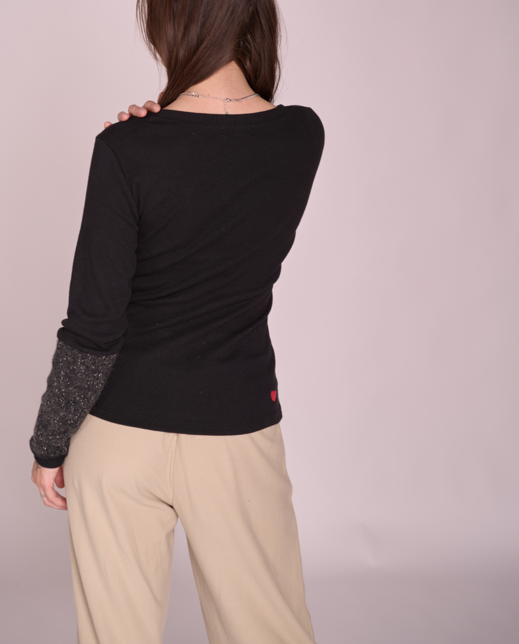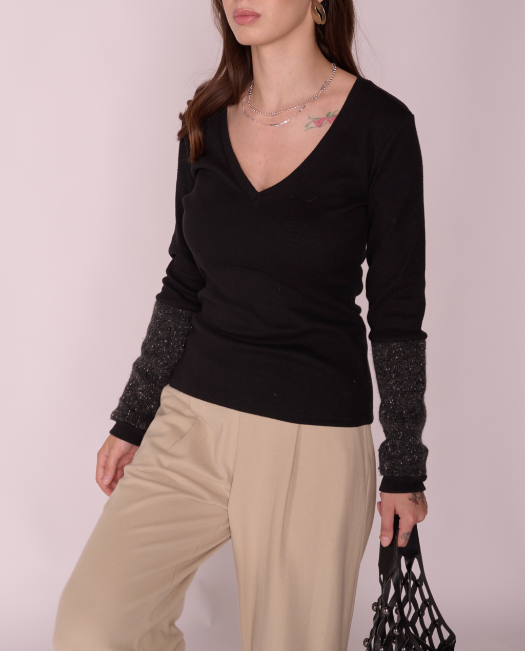 A pop of upcycled wool sweaters, turns this basic 100% cotton long sleeve v-neck top into a one-of-a-kind gem. Paired perfectly with a pair of jeans or a maxi skirt.