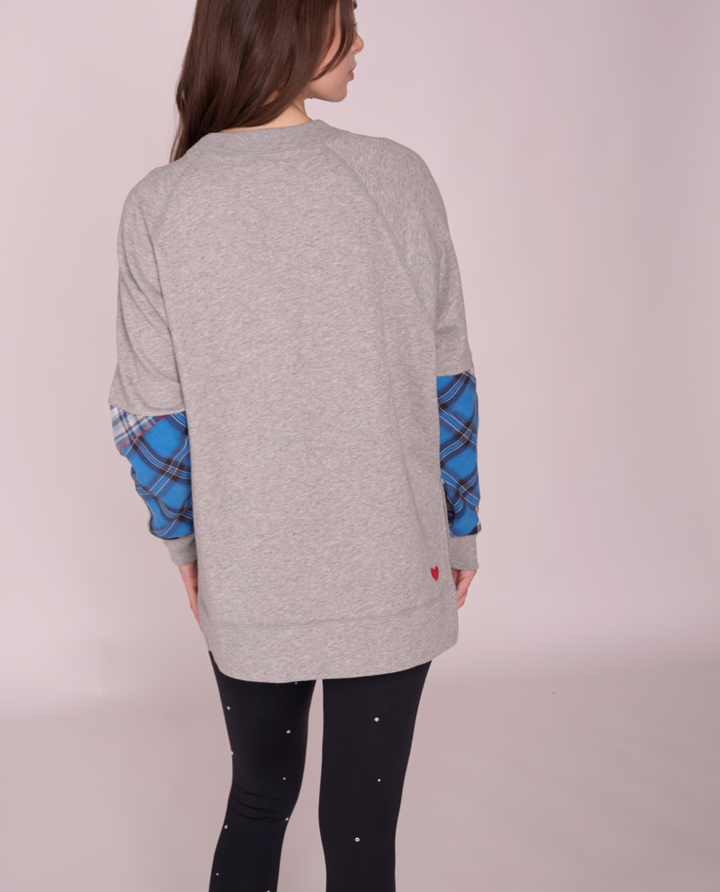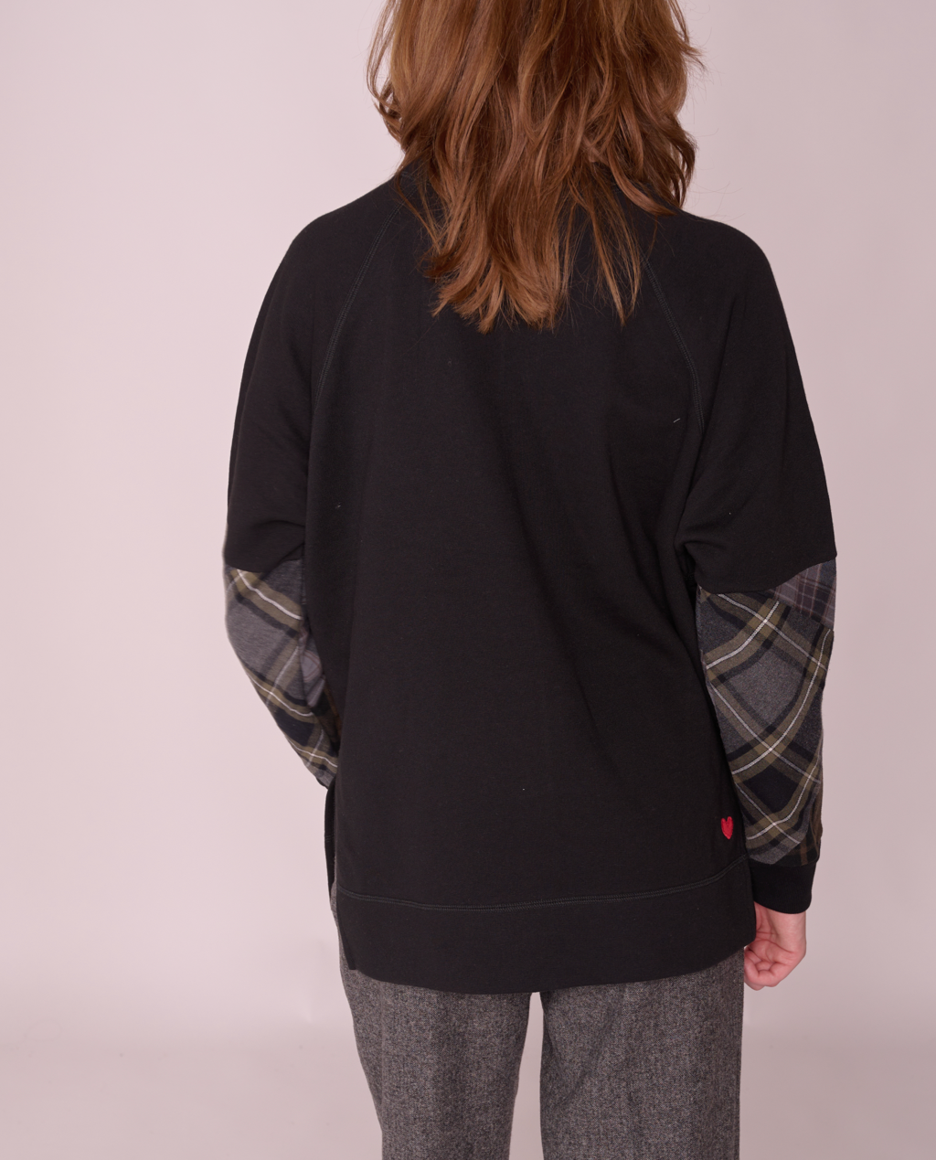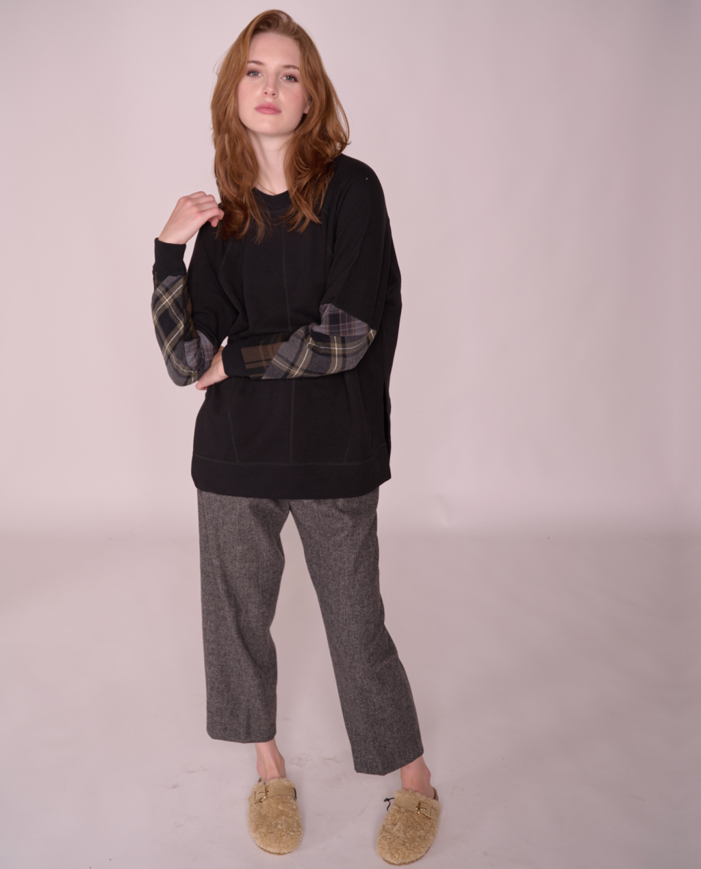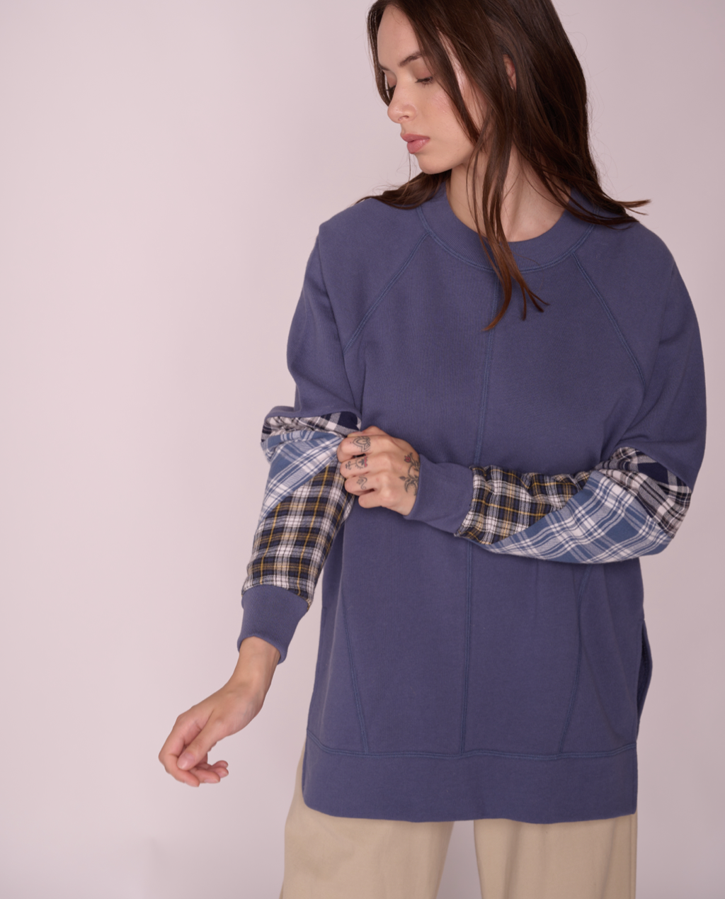 Mock neck sweatshirt featuring upcycled flannel panels on the sleeves, body has high slits. Made 100% cotton terry, for a soft lightweight feel.