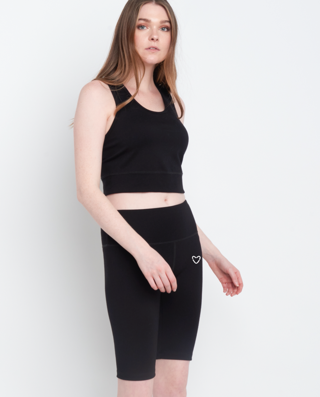 High waited 10” shorts, constructed from ponte - inside yoke made with upcycled striped tee and features upcycled denim heart appliqué and recycled heart screenprint. 68% viscose, 27% nylon,5% Spandex ponte fabric.