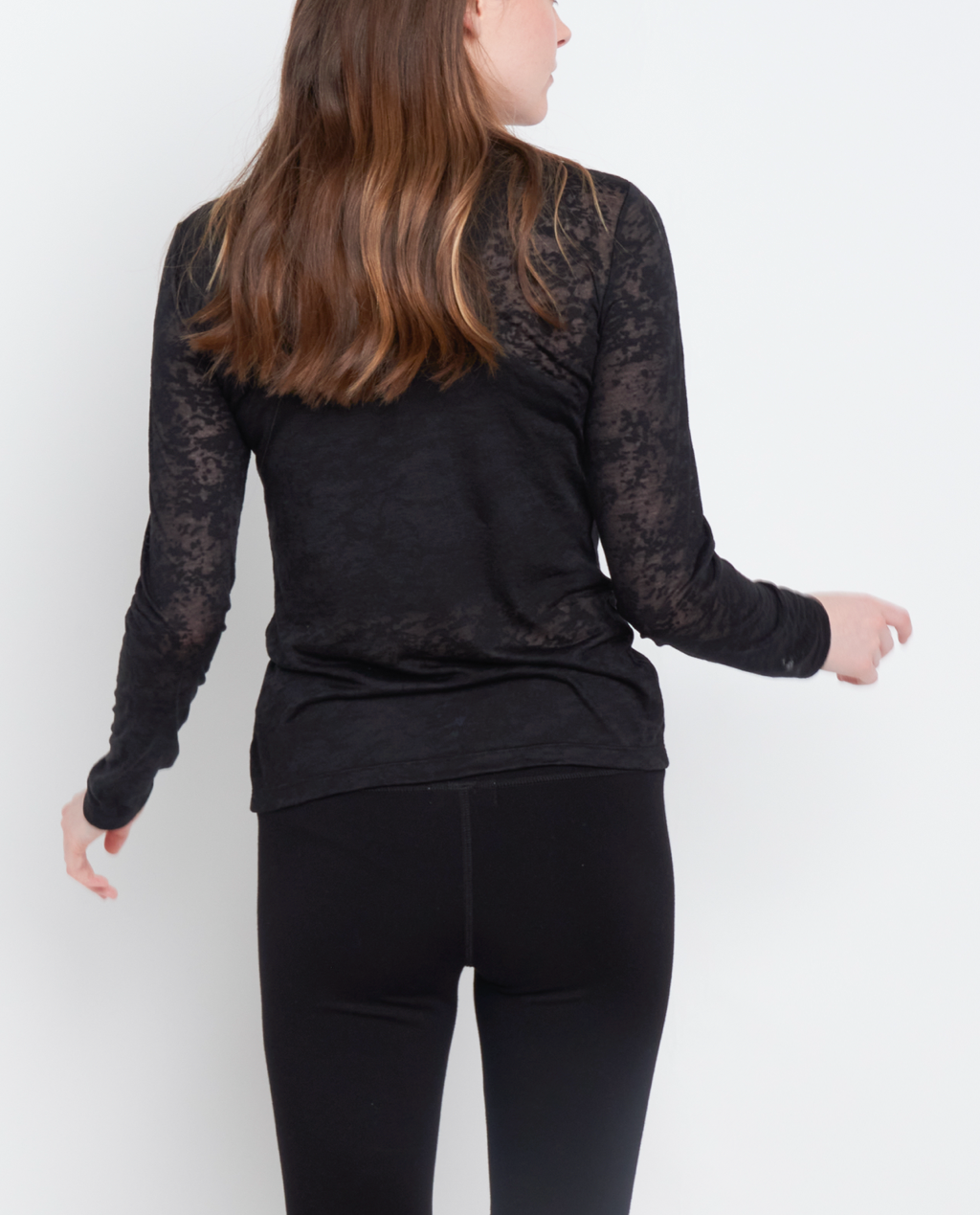 Lightweight, sheer crew neck long sleeve top, constructed from burnout design jersey with upcycled denim heart appliqué.