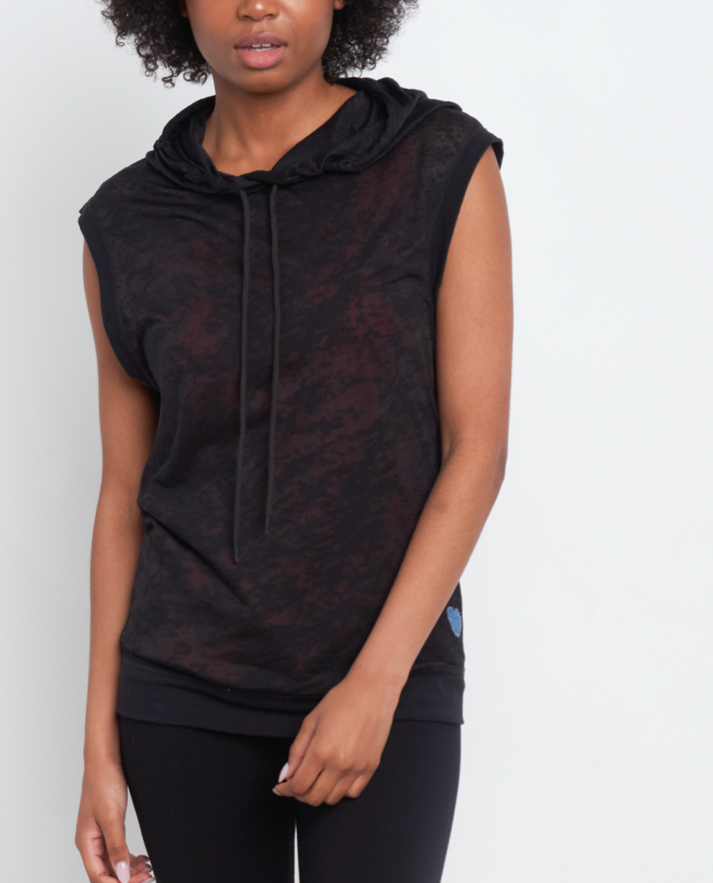 Lightweight hoodie top, constructed from burnout design jersey with upcycled denim heart appliqué.
